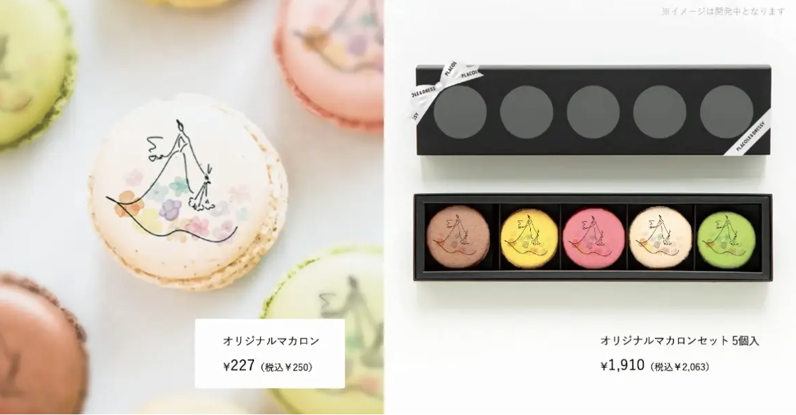 鮮やかな色合いのマカロンにDRESSY ROOM&Teaオリジナルのドレスを着た女の子のイラストが描かれたマカロン。アフタヌーンティーにさらにもう一品いかがですか?