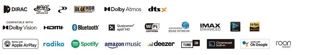 最新の立体音響フォーマット、Dolby Atmos® 、DTS:X® 、またIMAX enhanced にも対応しています。9chアンプを使って5.2.4ch、7.2.2ch、5.2.2ch+フロントバイアンプ接続、環境に応じて最適なスピーカ設定をお選びいただけます。Dolby Surround®や DTS® Neural:Xのアップミックス処理によりDolby Atmosや DTS:Xに非対応のソフトも臨場感溢れる立体音響でお楽しみいただけます。