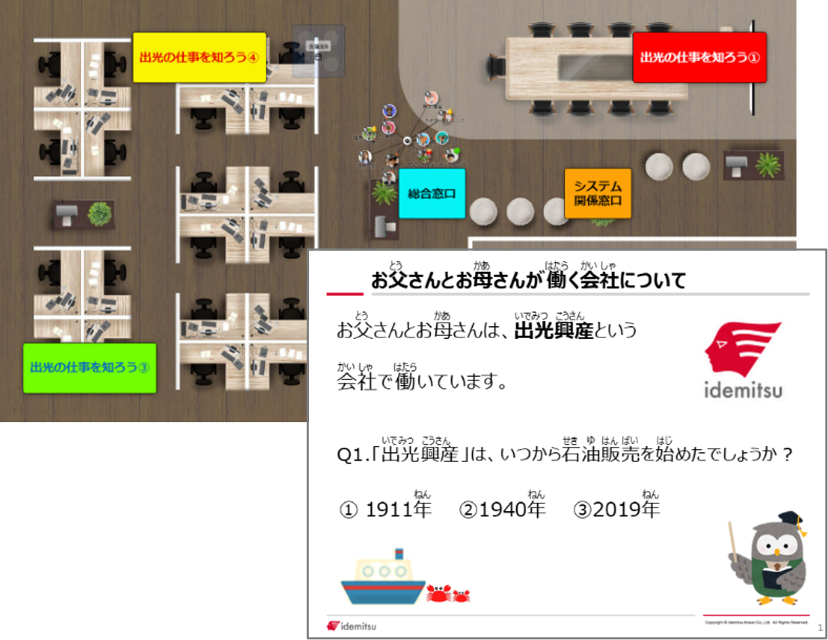 今回は、オンライン参加の部とリアル参加の部を設けました。オンライン参加の部では、12名のこどもたちがバーチャルの職場の中に設置されたクイズや動画を通じて、当社の事業内容や石油について学びました。