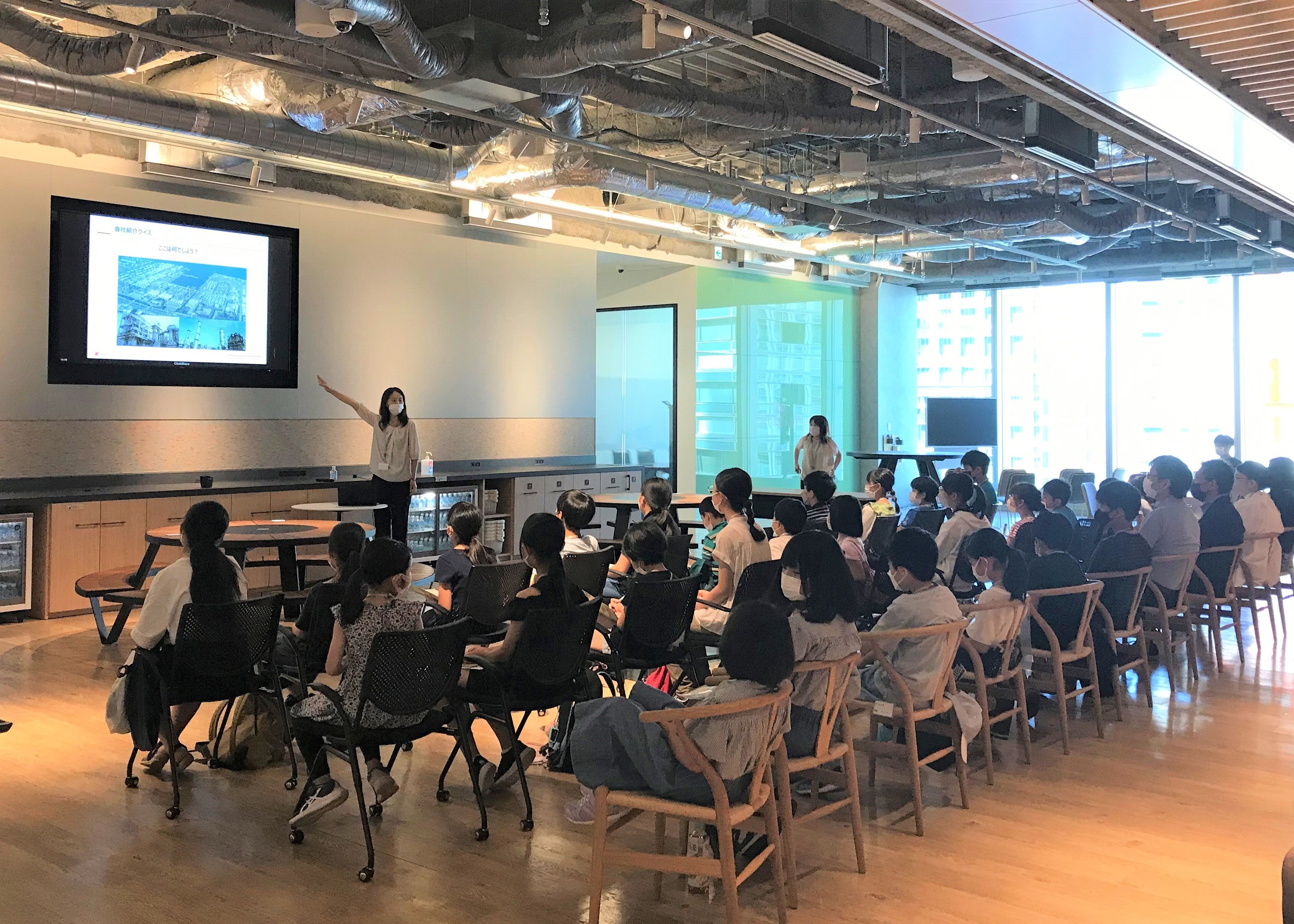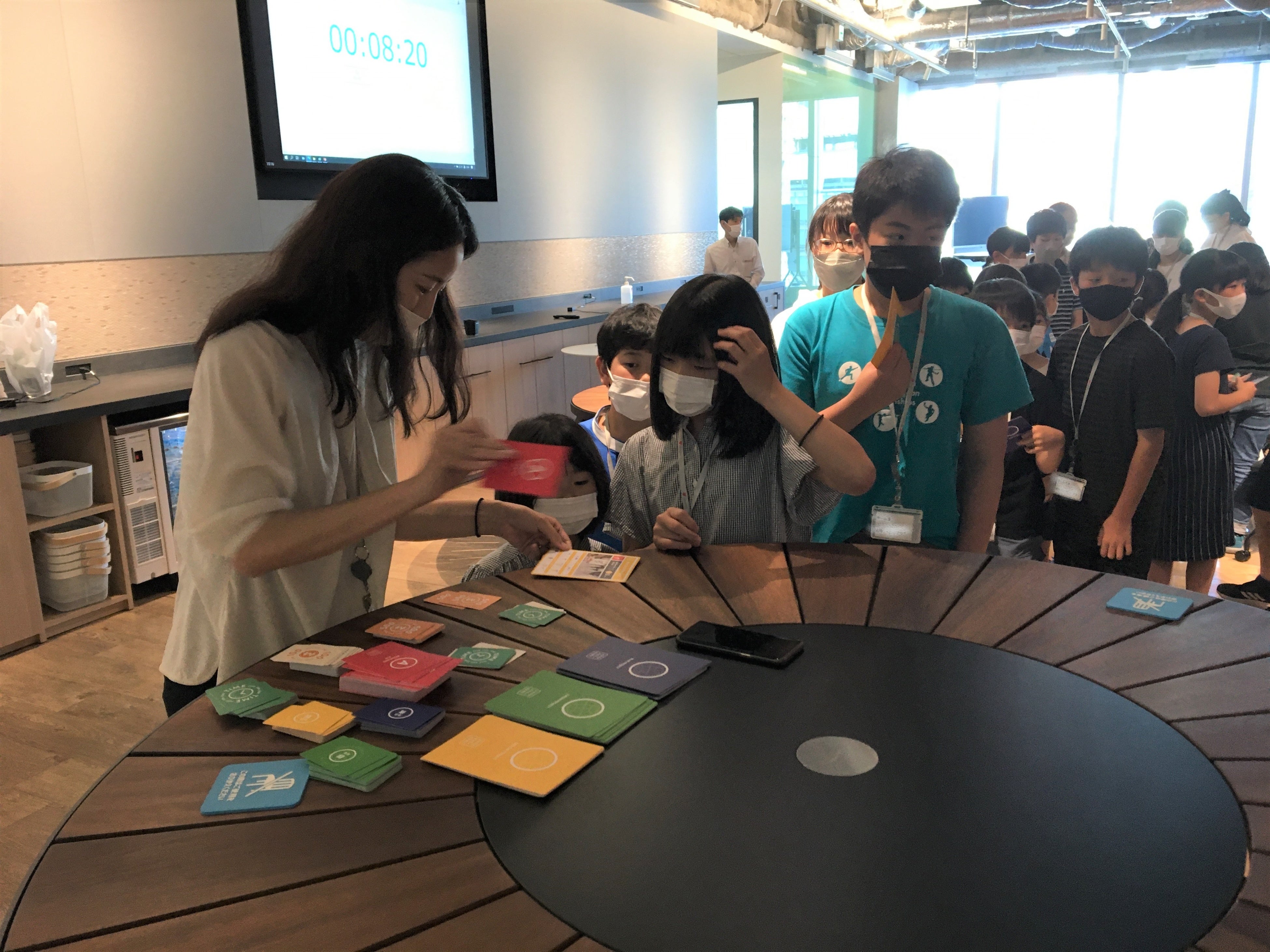 リアル参加の部では、26名のこどもたちが大手町にある本社を訪れ、当社の事業について説明を受けた後、カードゲームを通じてSDGsについても学びました。