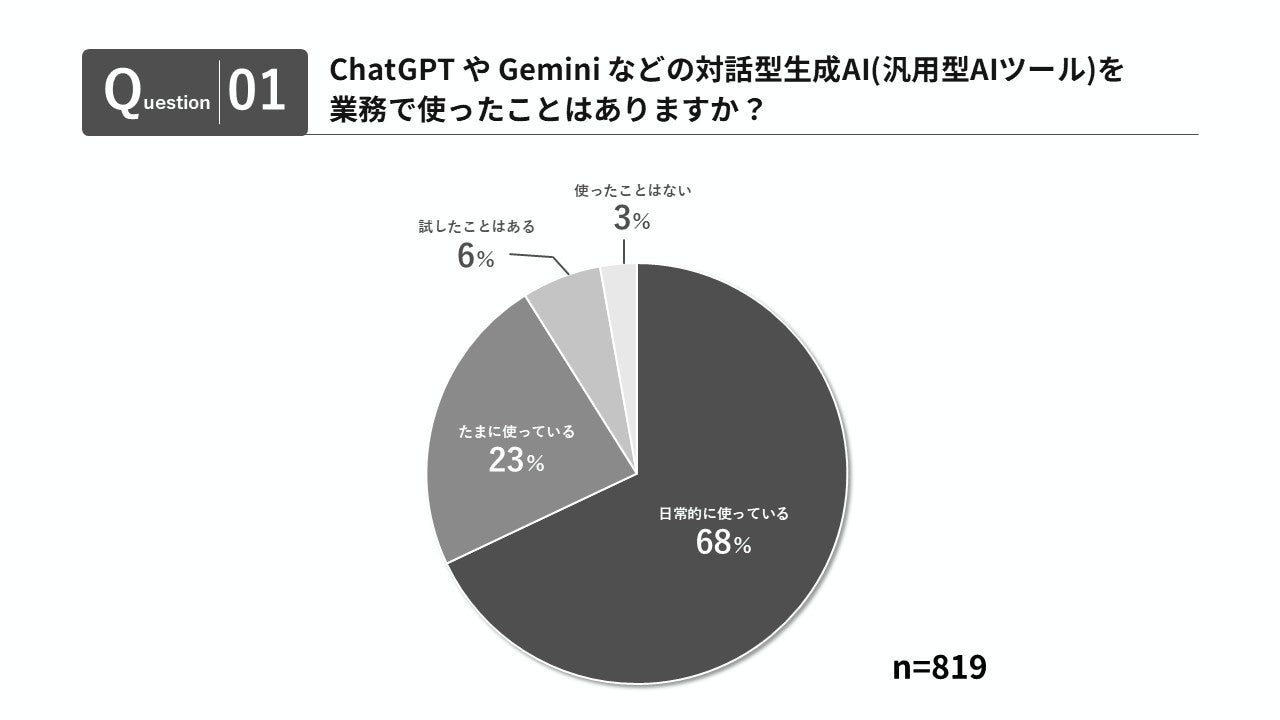 業務において汎用型AIツールを日常的・継続的に利用している割合は68%に達しました 。多くの現場でAIの社会実装が進み、業務に欠かせない基盤となっているフェーズの変化が示されています。
