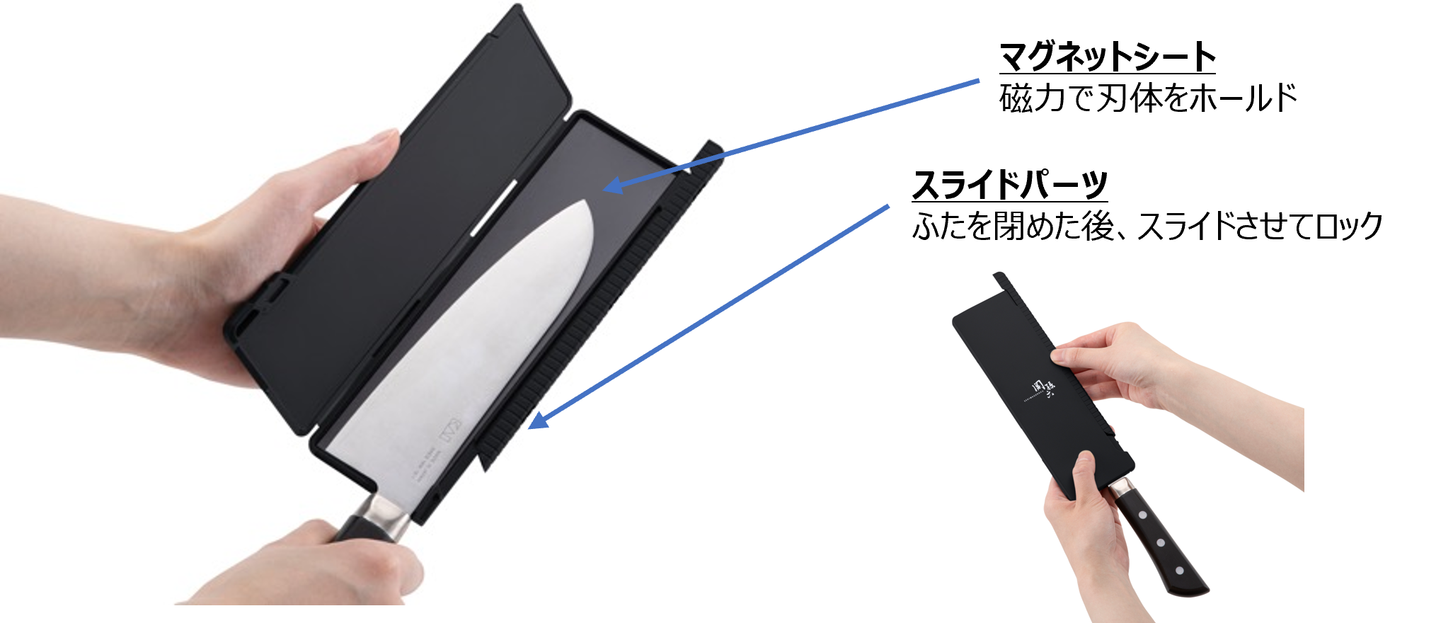 マグネットタイプのブレードガードはシンプルなデザインで使用シーンを選びません。磁力で刃体をホールドするのでケースの中で刃体がズレにくいことが特長です。加えて、安全性をより高めるため、外側にスライドロックを設けたダブルロック構造となっており、包丁がケースから滑り落ちにくい工夫が施されています。