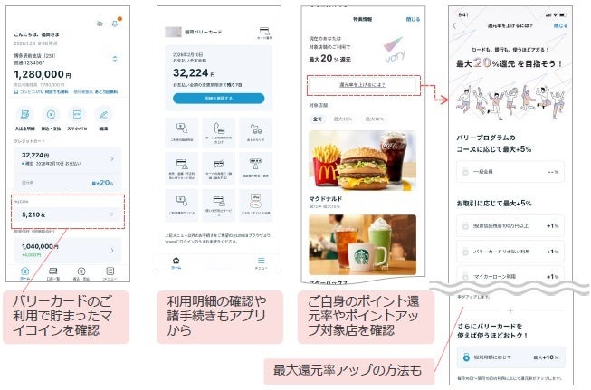 株式会社ふくおかフィナンシャルグループ(取締役社長 五島 久、以下「FFG」)は、「福岡銀行アプリ」「熊本銀行アプリ」「十八親和銀行アプリ」において、本日、機能追加を実施しましたのでお知らせします。 今回の機能追加では、同日からFFGが提供する新金融サービス「vary(バリー)」のリリースに合わせ、バリープログラムおよびバリーカードの関連機能を追加、また、各種画面の刷新等をおこないました。アプリを通じてvaryの提供価値である“お得さ”と“便利さ”をお客さまにお届けするとともに、今後も更なるサービス向上に努めてまいります。