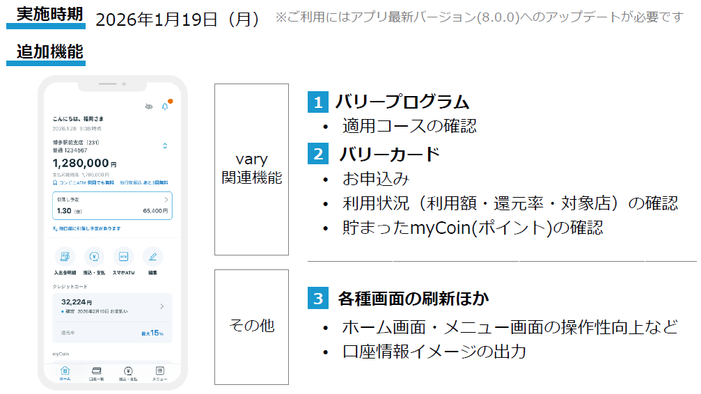 < 福岡銀行アプリ・熊本銀行アプリ・十八親和銀行アプリ >varyサービス関連機能追加のお知らせ