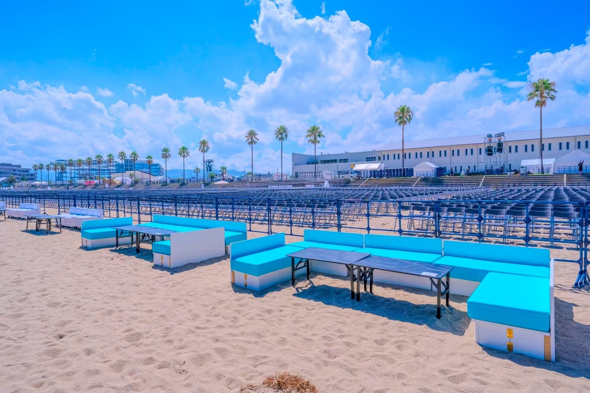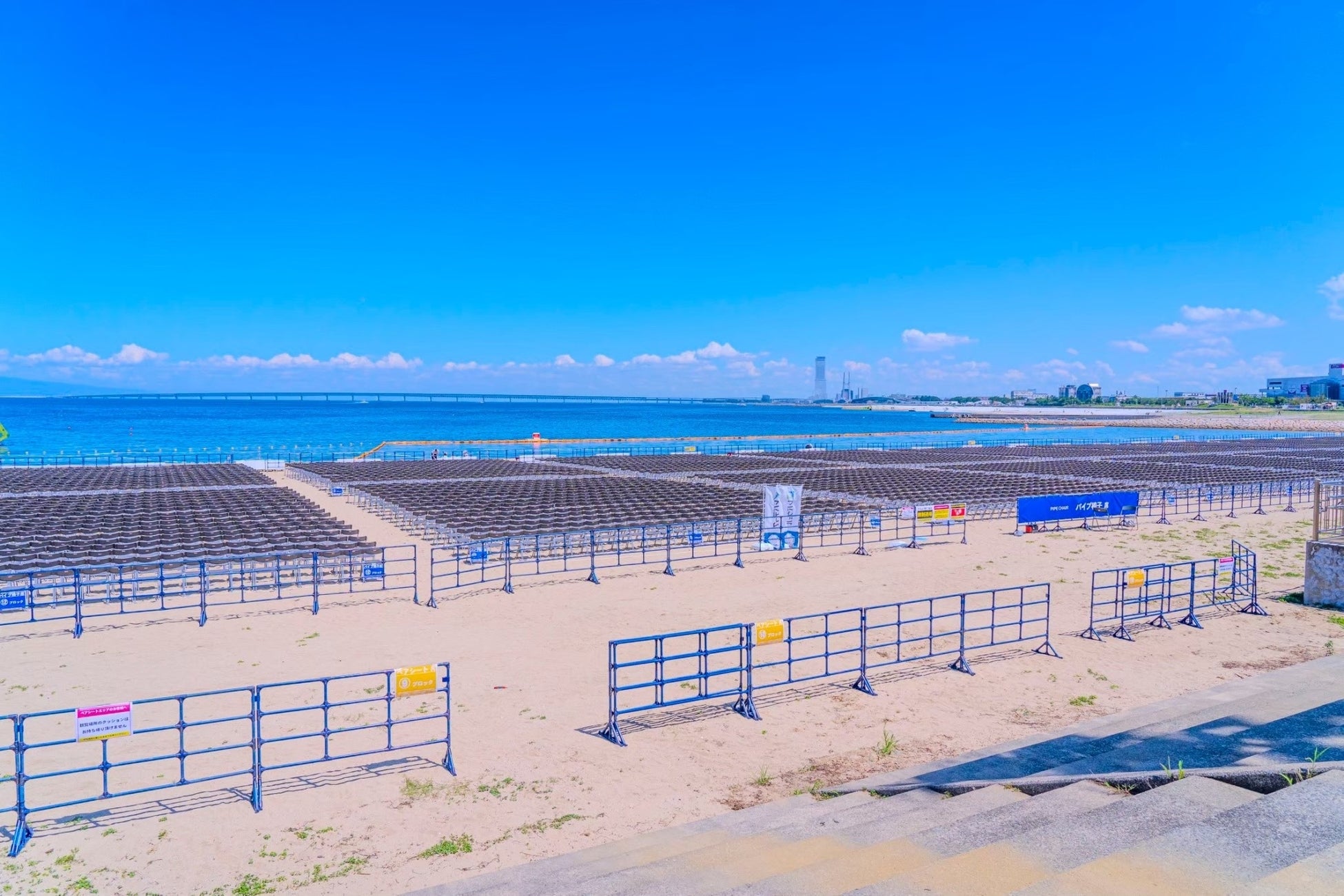 砂浜に設置されたパイプ椅子席です。正面から迫力のある花火演出をご観賞いただけるスタンダードなお席。