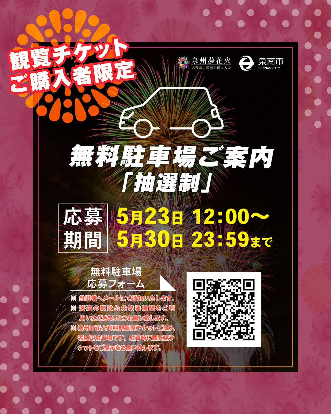 昨年も好評だった駐車場を今年も無料開放いたします。泉州夢花火有料観覧席のチケットをお持ちの方限定で、抽選にてご当選の方に限りご案内させていただきます。