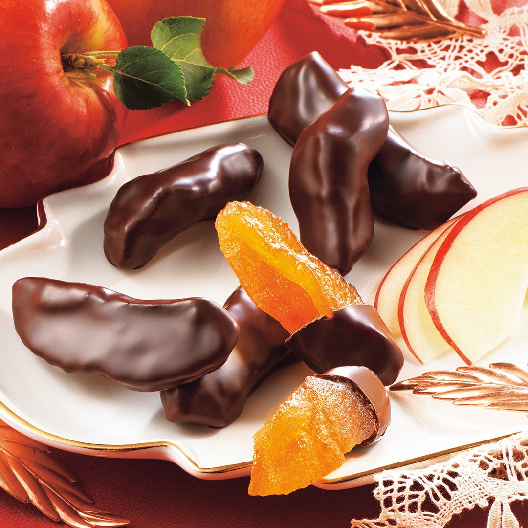 焼きりんごを、ワインにスパイスなどを加えた「グリューワイン」とりんごのブランデー「カルヴァドス ブラー XO」に漬け込み、スパイスをプラスし、ミルクチョコレートに散りばめました。サクサクとした食感の残る焼いていないりんごもプラス。洋酒に漬け込んだりんごの芳醇な香りと心地よい食感が、まろやかなミルクチョコレートととけ合います。