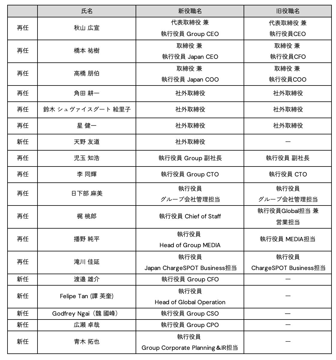 このたびの体制変更により、代表取締役 秋山広宣がGroup CEOとして各国にわたる事業を統括し、日本国内の事業はこれまでCFOを務めてきた橋本祐樹がJapan CEOとして牽引する新体制へと移行いたします。これにより、国内外での事業推進を加速させるとともに「グローバルで迅速かつ最適な意思決定ができる経営体制」へと一歩を踏み出します。