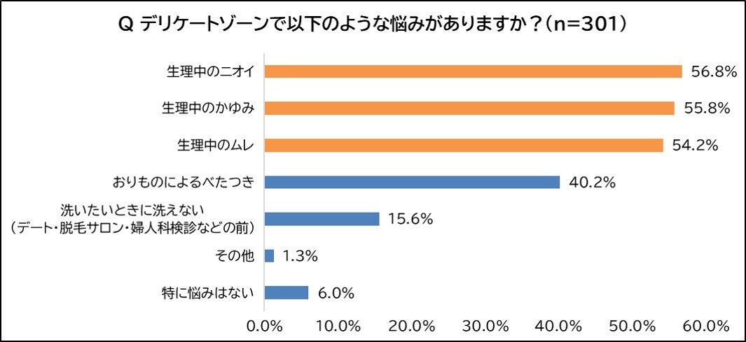 デリケートゾーンの悩みとして約半数以上の人が生理中の「ニオイ」「かゆみ」「ムレ」の悩みを抱えています。