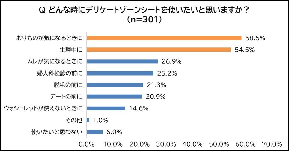 デリケートゾーンシートの使用意向として多かったのは「おりものが気になるとき」で58.5%と最も高く、次いで「生理中」が54.5%であり、婦人科検診や脱毛、デート前などのエチケットケアとして外出先でも使用したいとの声もありました。