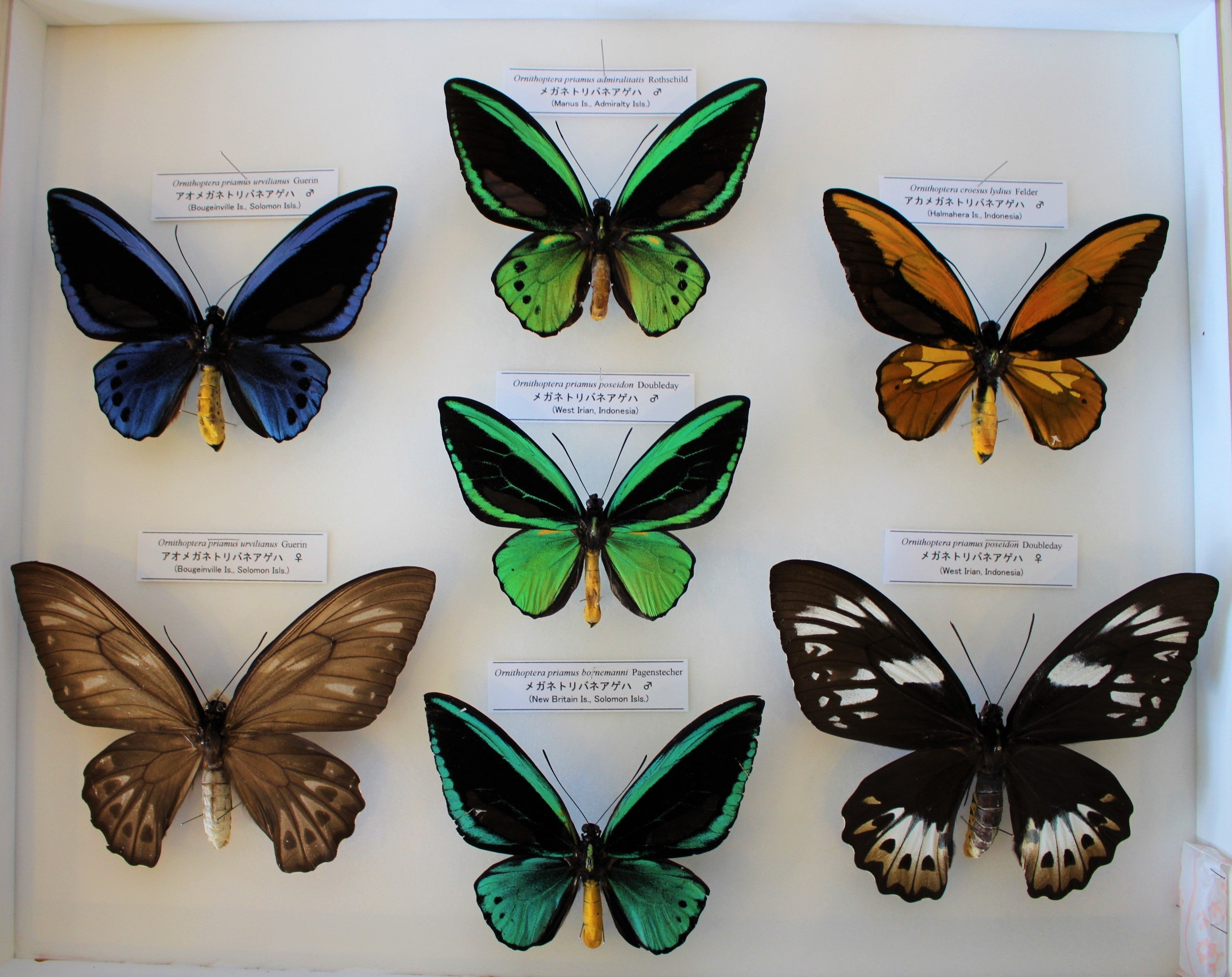美しいモルフォチョウや大きなトリバネアゲハ、木の枝や葉にそっくりなナナフシやコノハムシ、巨大なカミキリムシやハナムグリなど、様々な熱帯の昆虫の標本を展示します。