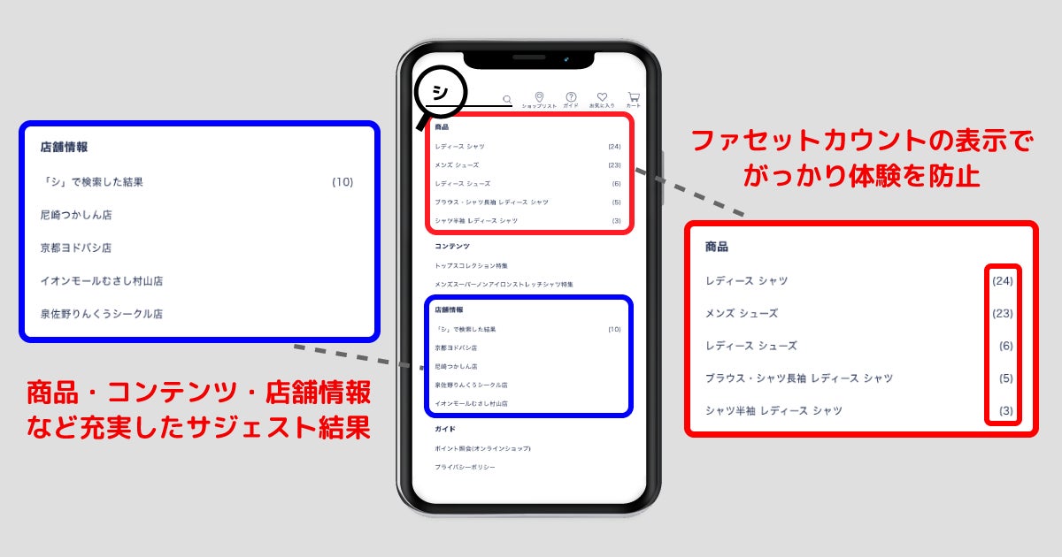 「商品」に加え「コンテンツ」「店舗情報」「ガイド」などサジェストの結果を充実させることで、ユーザーが求めている情報へのスムースな誘導が可能となりました。