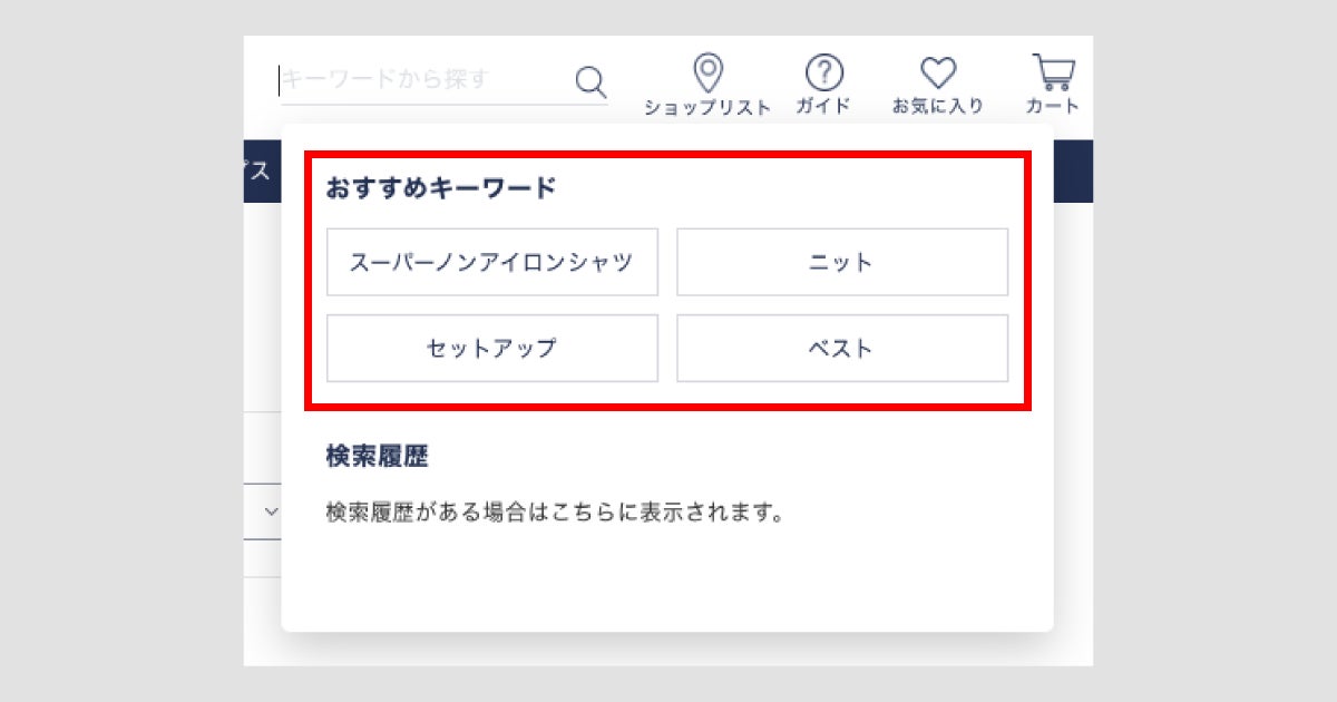 検索窓にカーソルを合わせた際に「セットアップ」「スーパーノンアイロンシャツ」などおすすめキーワードの表示をすることで新たな商品との出会いを創出し、商品の買い合わせによるクロスセルの実現が期待できます。