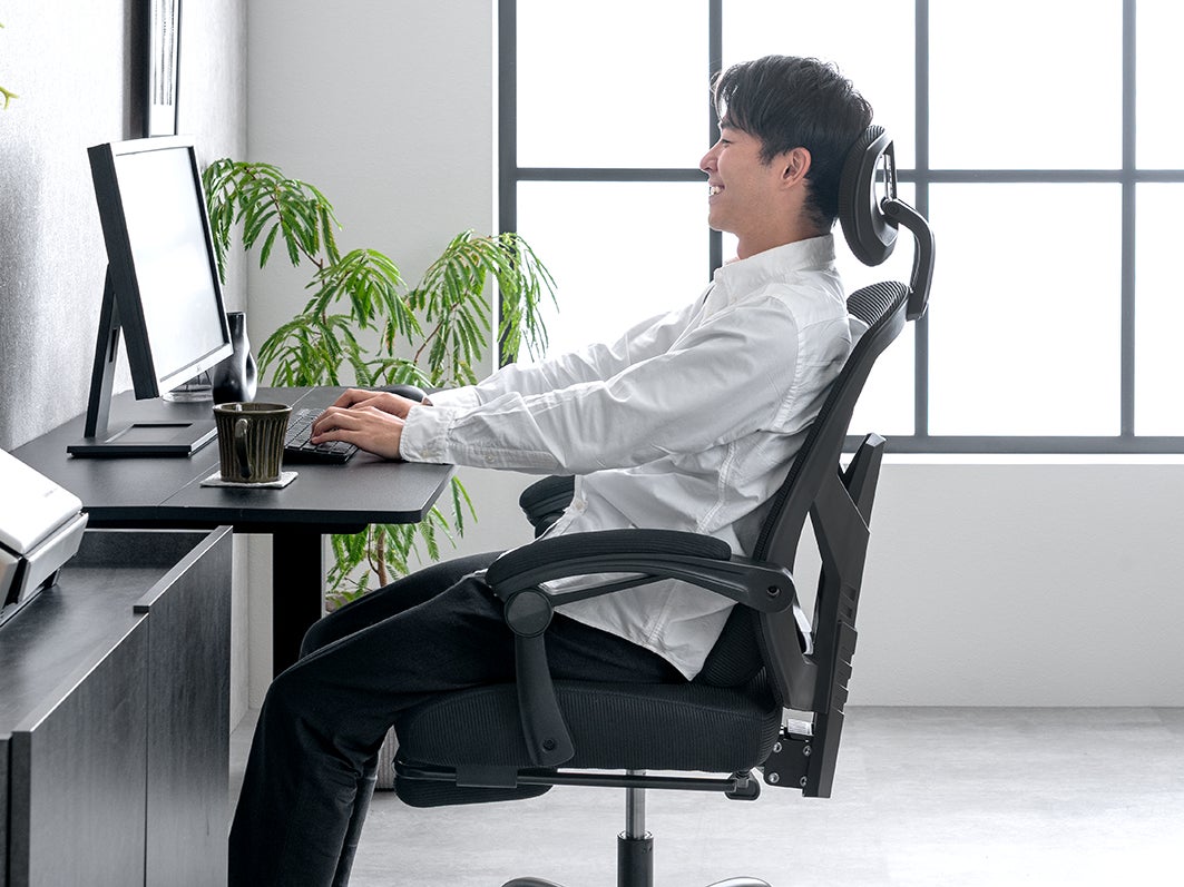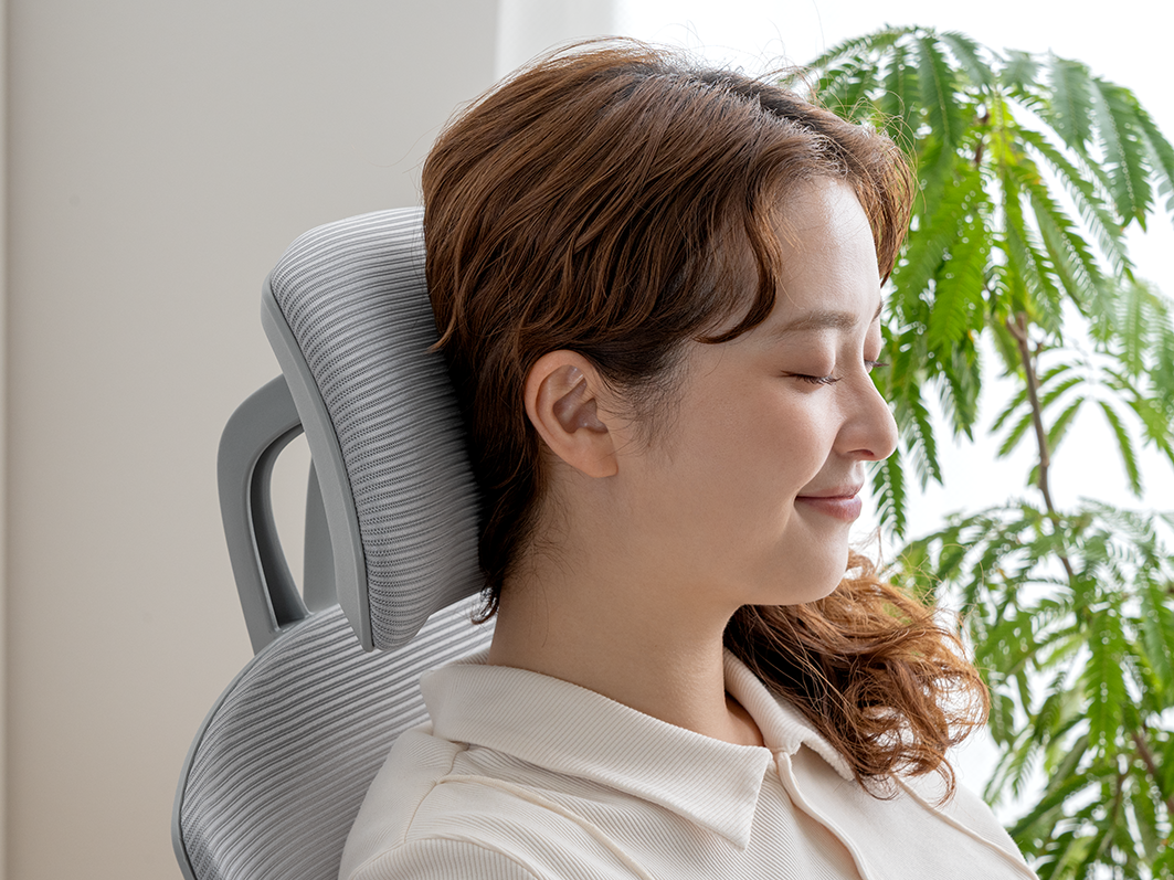 リクライニング時にも頭部が安定しやすく、首への負担を軽減し、長時間の作業だけでなく、休憩時の快適性も高めています。