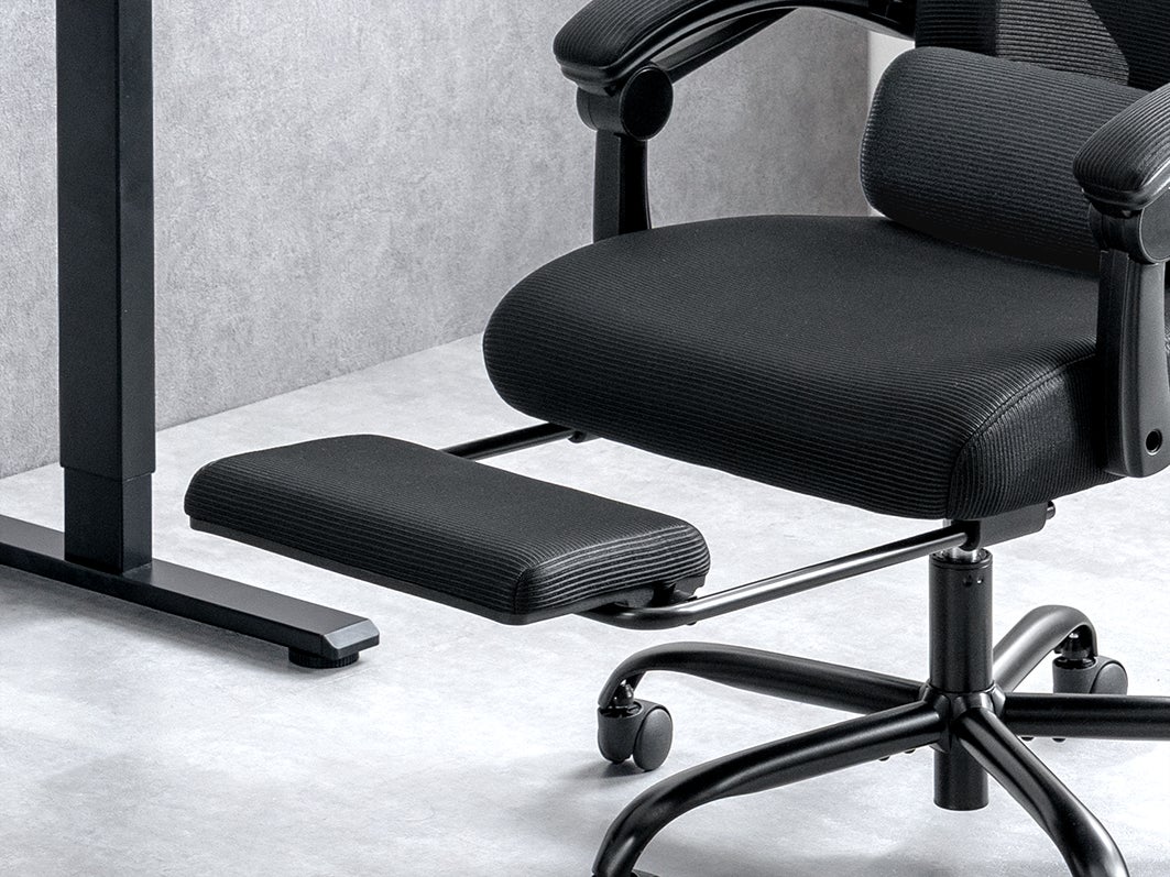座面下に収納されたフットレストを引き出すことで、脚を伸ばしたリラックス姿勢に切り替えが可能です。