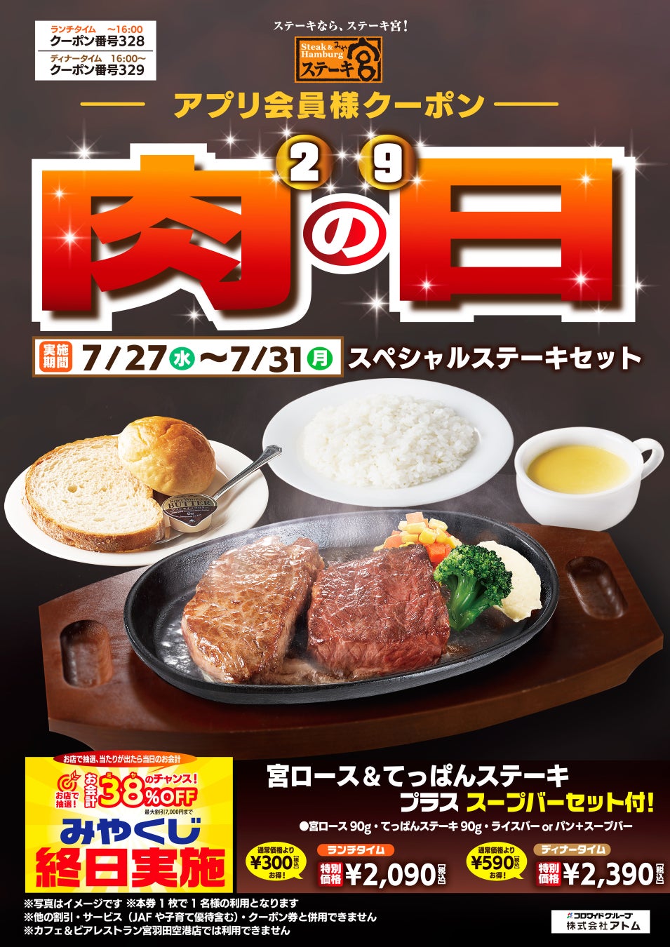 \ 今月もやります!ステーキ宮の肉の日 !/アプリ会員とTwitterフォロワー限定お得なクーポンプレゼント2023年7月27日(木)~7月31日(月)