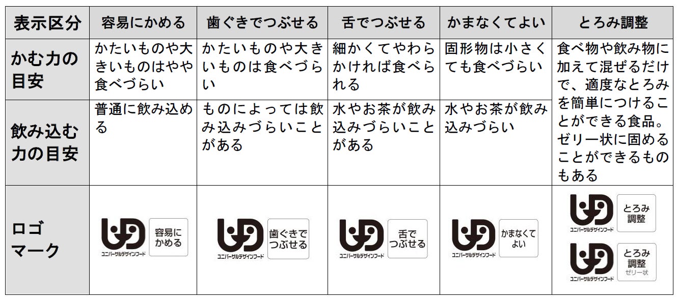 ※1 日本介護食品協議会が定めたユニバーサルデザインフードの自主規格。かむ力や飲み込む力に応じた4区分(容易にかめる・歯ぐきでつぶせる・舌でつぶせる・かまなくてよい)と、とろみ調整で構成。