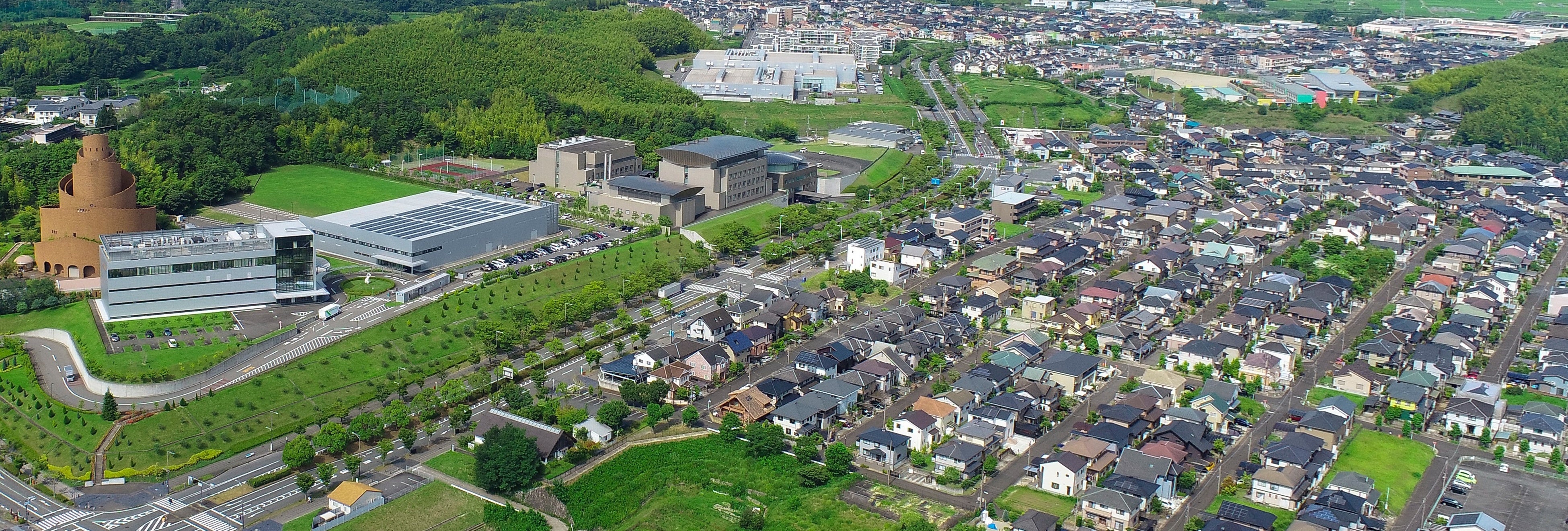 木津川市上空からの写真(中心奥、茶色の建物がロートリサーチビレッジ京都)