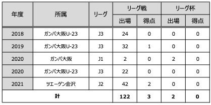 J1リーグ 2試合(0得点) / J2リーグ 42試合(2得点)