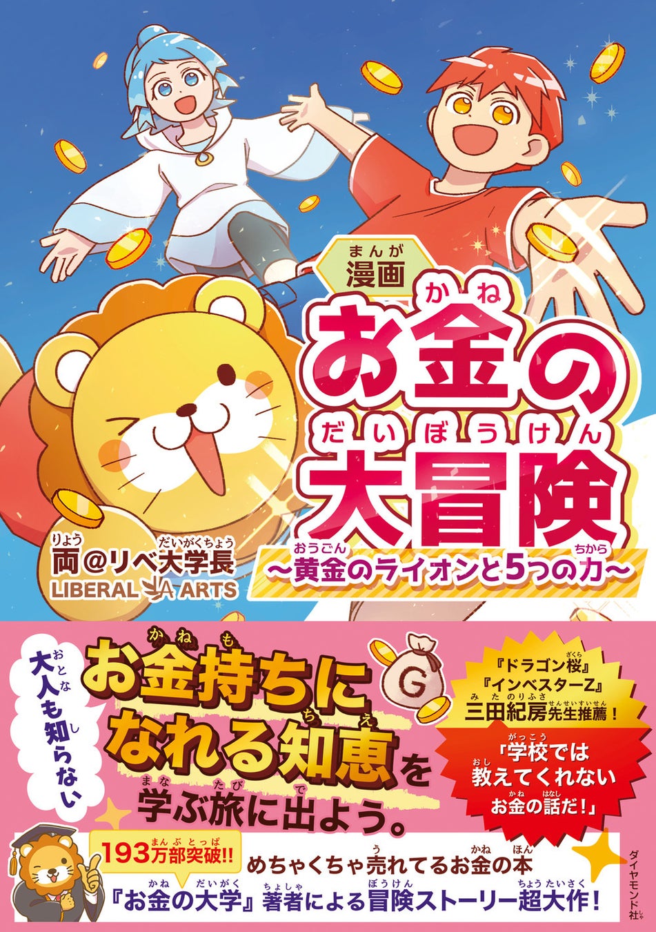 著者は、お金の教養を日々発信する両@リベ大学長氏。登録者289万人のYouTubeチャンネル「リベラルアーツ大学」を運営し、著書『本当の自由を手に入れる お金の大学』(朝日新聞出版)は累計193万部を突破するなど、まさに“お金の教養を伝える第一人者”です。そんな著者が、「学校では教えてくれないお金の話を、子どもに直接届けたい」という思いから、構想・制作に4年をかけて完成したのが本書です。オールカラー556ページの漫画と壮大な冒険ストーリーで、小学生からお金の基本が学べる1冊となっています。