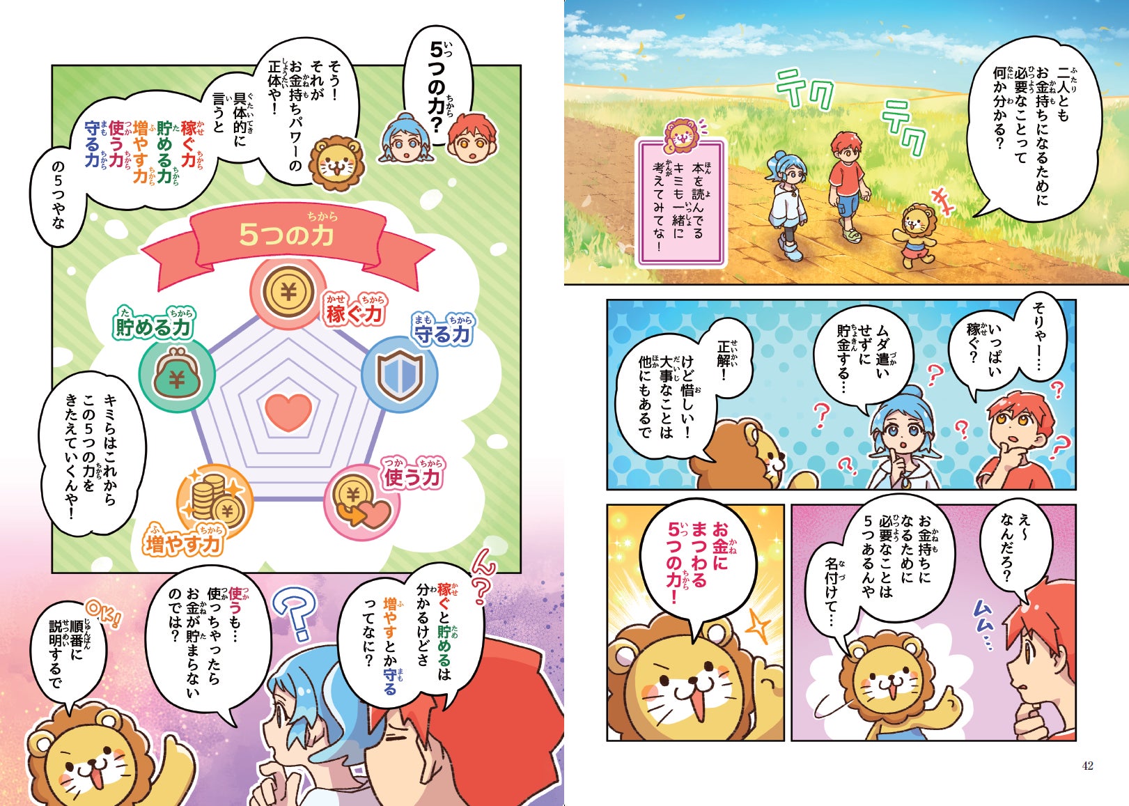 漫画の主人公は、平凡な小学生のソータ。ひょんなことから異世界に飛ばされたソータは、お金の妖精リョーちゃん、水の国の少女メグと共に、お金持ちになるための旅に出ることに。数々の試練を乗り越えながら、お金にまつわる5つの力(稼ぐ力・貯める力・増やす力・使う力・守る力)を鍛えていきます。この5つの力は、現実世界でも役立つお金の基礎知識のため、ソータたちの成長物語を通じて、子どもも大人も金融リテラシーを身につけることができます。