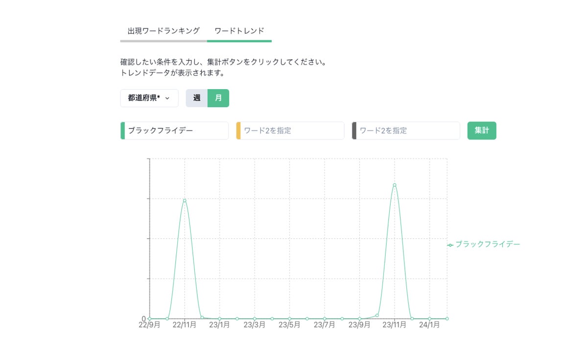 以下の図は、「ブラックフライデー」の掲載店舗数を集計した画面です。グラフを見てみると、2022 年よりも 2023 年の方が多くの店舗で掲載されていることが分かります。データに裏付けられた説得力のある企画を立案し、提案するには、従来は多大な労力を要しましたが、「チラシアナライザー」は市場分析やトレンド調査を容易に行うことができます。また、指定した期間において掲載数が多かった人気の企画を「出現ワードランキング」で確認できる他、実際のチラシ画像をツール上で閲覧することができるため、従来に比べて保管と検索の手間を大幅に削減できます。
