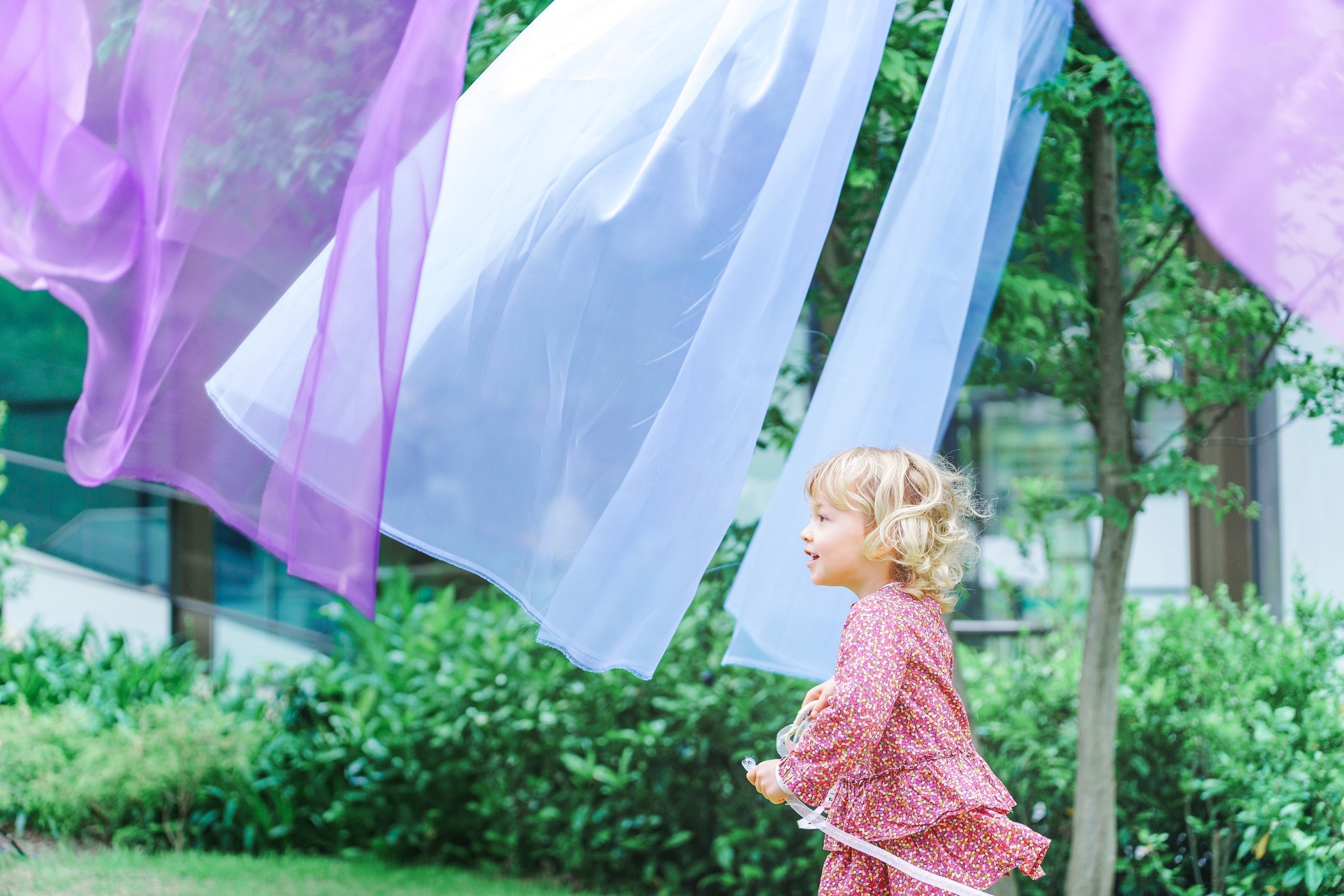 暦の色に合わせた5色のオーガンジーが新緑の風にたなびく巨大な迷路。薄く軽やかな布は広場全体に広がり、重なり合うことで新しい色を生み出し、透過する太陽の光を美しく受け止めます。風のゆくえに目を向けながら、布の隙間を走ったり、手を伸ばしたり、全身で色と風を感じながら、自然との一体感を楽しめます。