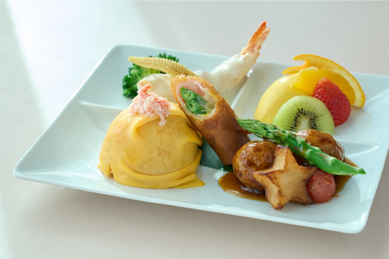 希須林のシェフが試作を重ねて生み出した、ゴールデンウィーク限定のスペシャルメニュー。前菜はお子さまが食べやすいサイズに仕上げた、定番人気のエビマヨネーズと鶏と豚の肉団子。彩りにはハムとチーズとインゲンの春巻きを。メインはケチャップチャーハンに、蟹のほぐし身をトッピング。デザートはマンゴープリンとフルーツの盛り合わせにしました。