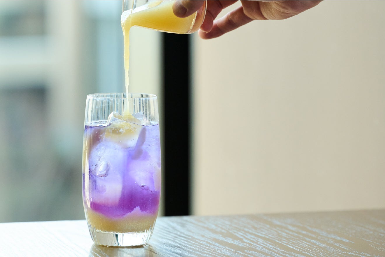 「FAMILY GREEN アトリエGW特別編」と連動した、期間限定ドリンク。蝶々が羽を広げたような青色の花を咲かせるハーブ「バタフライピー」を使ったレモネードです。「にっぽんのいろ」をイメージした鮮やかなブルーのドリンクに、有機レモンがベースのレモンシロップを注ぐと、色が美しく変化します。かき混ぜるほどに、青から紫へと移ろう華やかなカラーの変化をお楽しみください。