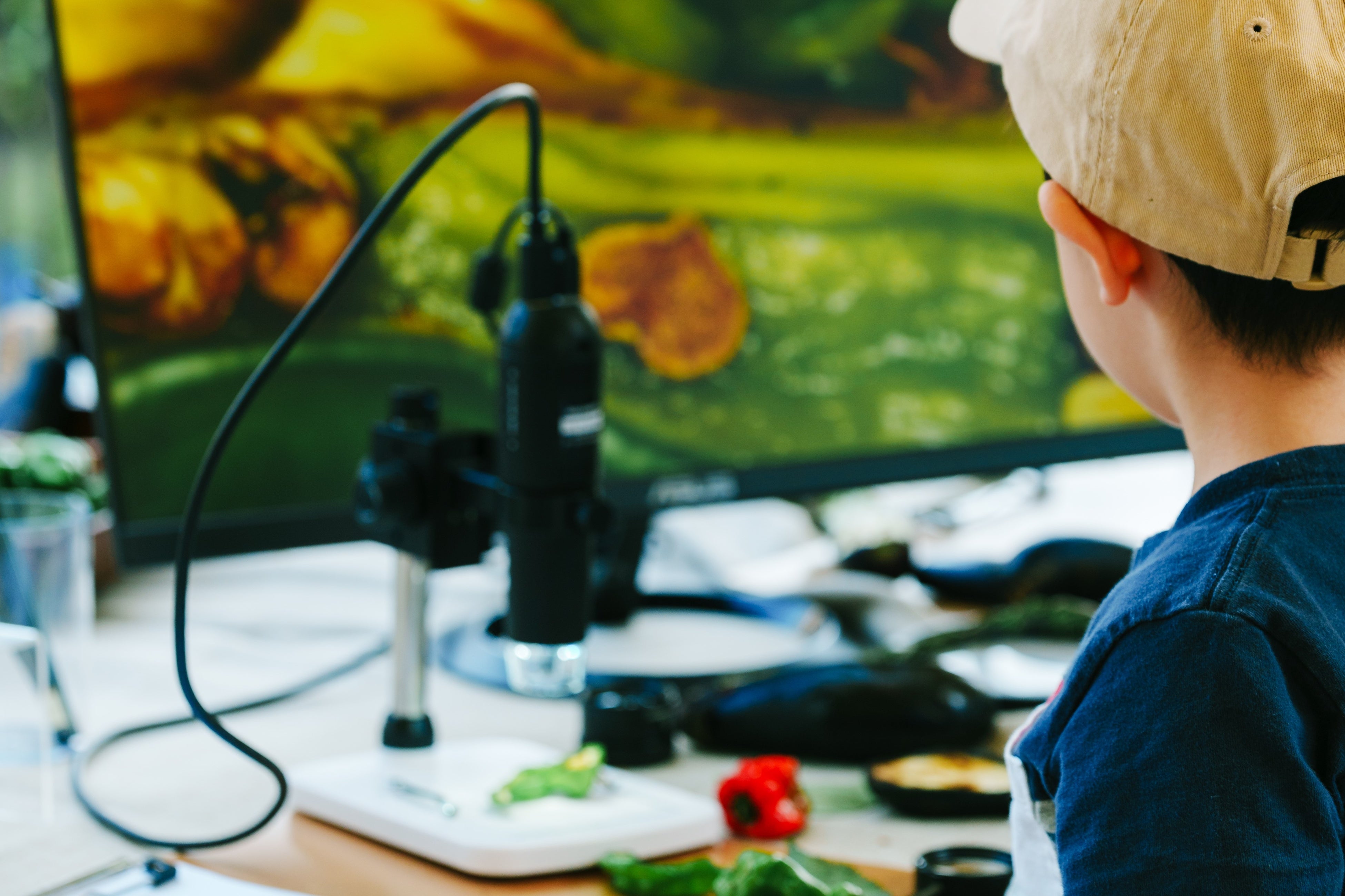 野菜や果物を観察し、その味わいの源をたどるアトリエです。マイクロスコープ越しに広がるミクロの世界には、肉眼では気づかなかった不思議な模様やテクスチャーが現れます。観察のあとは、ぜひトーキョージュースの店舗へ。アトリエで見つめた野菜や果物から生まれたジュースの味を確かめてみてください。