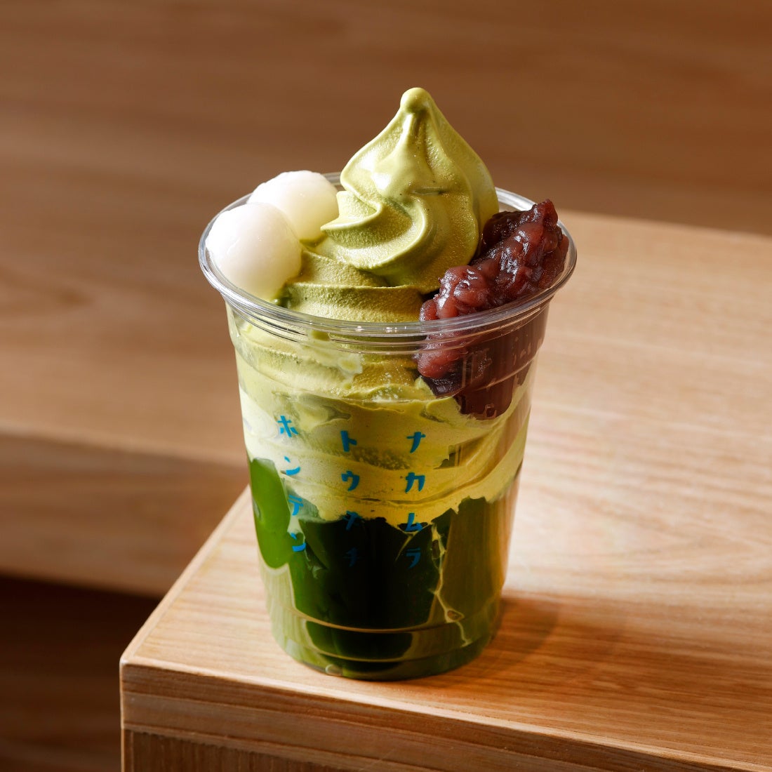 抹茶の旨みをしっかり味わえる生茶ゼリイに、なめらかな抹茶ソフトクリーム、白玉、あずきを重ねました。ひんやりとしたソフトクリームの口どけと、あずきのやさしい甘みが抹茶の風味を引き立てます。見た目以上に満足感があり、ご家族でシェアして楽しむのもおすすめです。