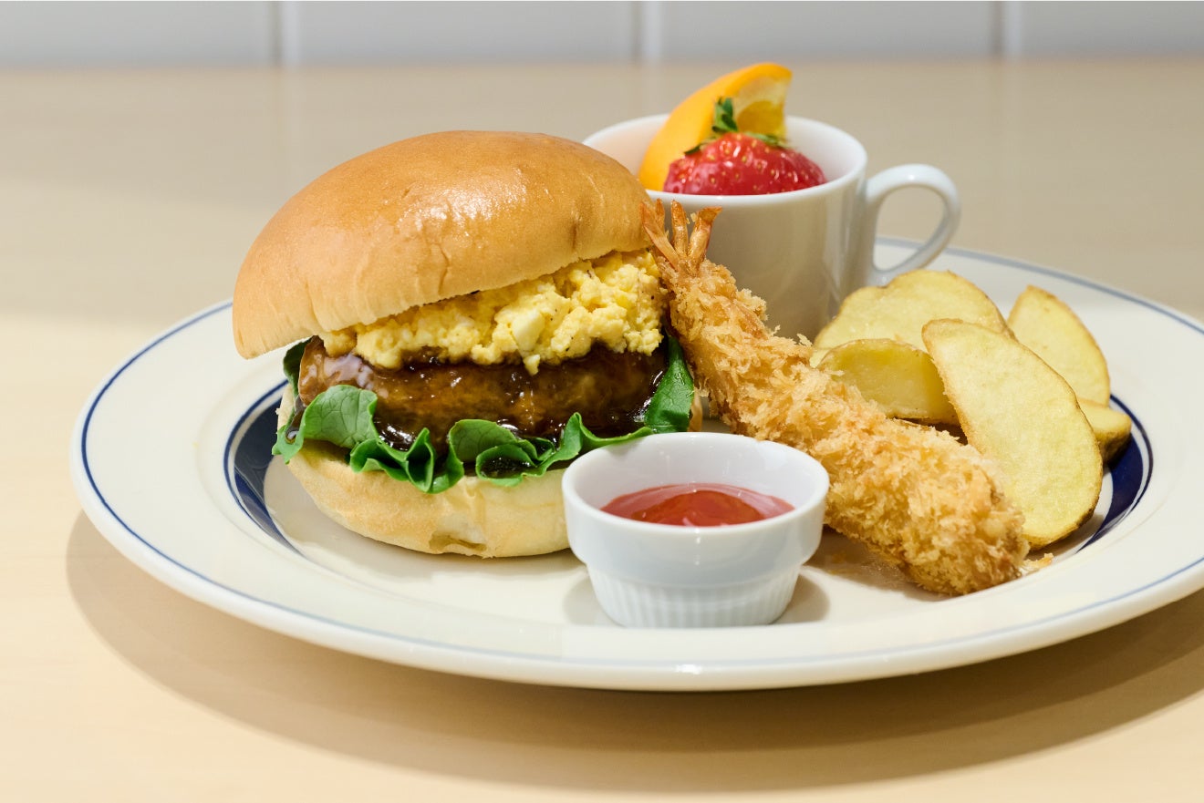 たまごサラダとボリューミーなパティを使用した「てりたまバーガー」。旨味たっぷりの醤油麹で作った甘い照り焼きソースに、特製たまごサラダとパティが程よく口の中で絡まります。大きな口で頬張れるよう、バーガー袋もご用意しました。エビフライと大ぶりカットのポテトフライもついてボリューム満点!駅前広場に面した開放感のあるスペースで、お子さま連れでもリラックスしてお過ごしいただけます。