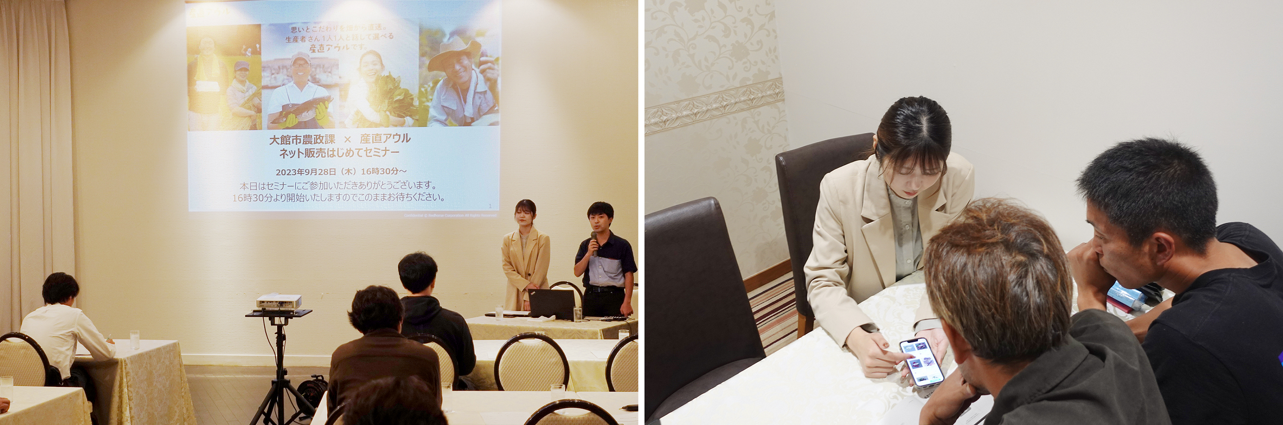 セミナー当日は、産直アウルスタッフが大館市に直接赴き、産直ECサイトの説明や当社サービスを紹介しました。説明では「こだわり食材を市場を通さず直接販売したい、自分で食材の値段を決めたい、購入者と直接コミュニケーションを取りたいと考えている方はぜひ産直ECサイトを検討いただきたい」と呼び掛けました。