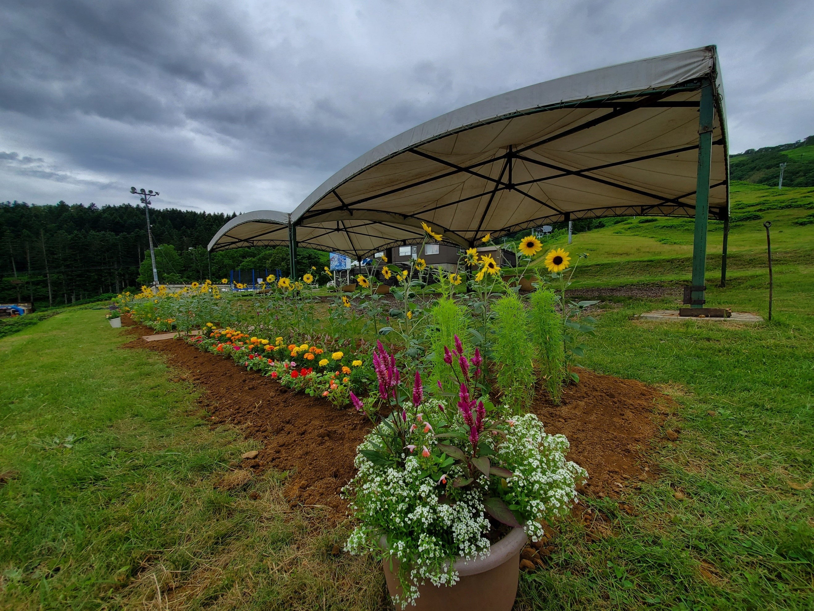 「お花畑」と「お花のフォトスポット」の取り組みは、(一社)倶知安観光協会主催のスカイバスニセコ(運 行期間:2022 年 7 月 15 日(金)〜8 月 28 日(日) )の運行に合わせて企画いたしました。停車スポットのひらふウェルカムセンターはホテルニセコアルペンから徒歩 3 分に位置しています。ホテルニセコアルペンでは、スカイバスニセコの乗車特典としてホテル内の天然温泉、プールの割引などをご用意していたことから、お立ち寄りいただくお客様に楽しんでいただけるよう北海道倶知安農業高等学校と協働でお花畑をご用意します。「観光客、地域の皆さんが気兼ねなくくつろげる場所」を作る主旨に共感してくださった北海道倶知安農業高等学校の協力で、生徒が大切に育てた苗木を提供いただき、100 本のひまわりをはじめ、パンジーなどホテルスタッフと一緒に花壇を設置しました。隣接する大型テント、トランポリンは皆様にご自由にご利用いただけます。リラックスチェアに座りながら、小川のせせらぎ、鳥やセミの声、風に揺れるひまわりなど自然の中に身を投じてお楽しみください。高校生が考案した「お花のフォトスポット」も魅力の一つです。