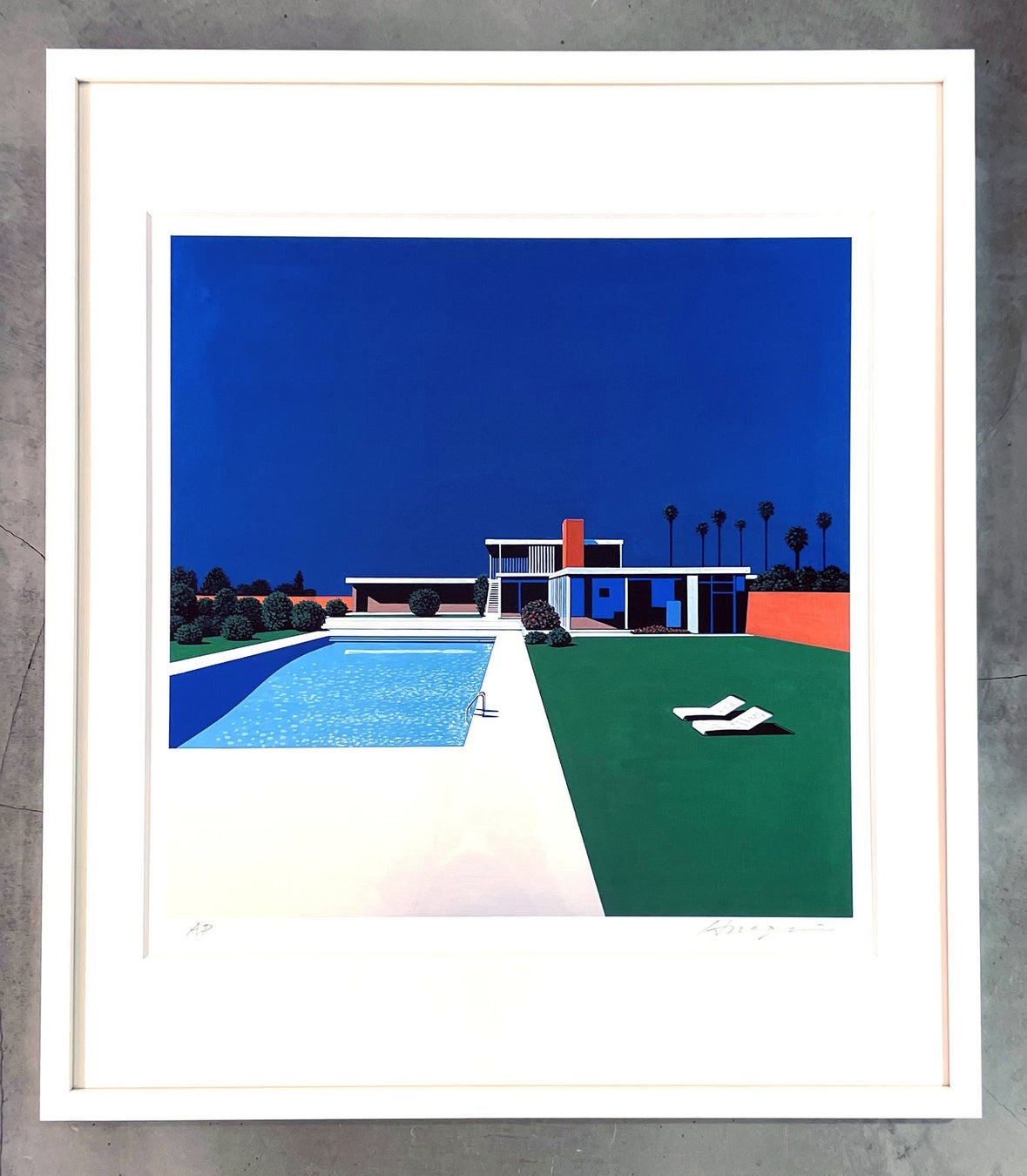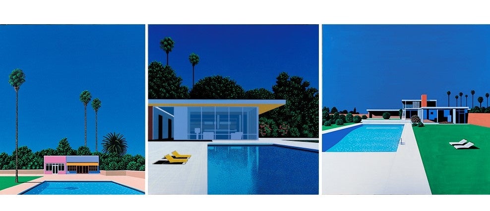 作品説明:ガラス張りのモダンな邸宅がプールの水面に映りゆらいでいる。澄みきった青い空と林立する木々とのコントラスト。最新作品集のカバーを彩った、永井博のあらたな代表作。
