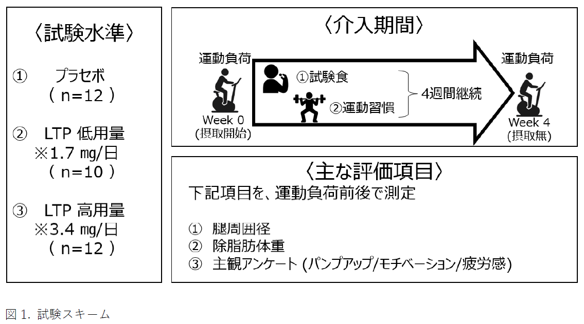 日本人の筋力トレーニング習慣がある成人男性34名を、(1)LTPを含まない対照食品(プラセボ群)、(2)LTPを1.7㎎(VPP:0.7㎎、IPP:1.0㎎)含む食品(LTP低用量群)、(3)LTPを3.4㎎(VPP:1.4㎎、IPP:2.0㎎)含む食品(LTP高用量群)をそれぞれ摂取させる群に無作為に分け、ランダム化プラセボ対照二重盲検並行群間比較試験を実施しました。試験食品を4週間継続摂取させ、脚の高強度運動(自転車エルゴメーター〔POWER MAX V3 Pro、コナミスポーツ株式会社〕を用いた無酸素パワーテスト)前後の大腿周囲径、除脂肪体重、主観評価によるパンプアップ感、トレーニングに対するモチベーション、疲労感を評価しました。
