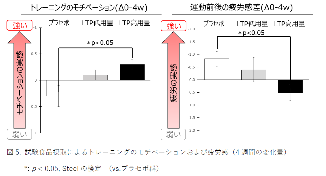 5点リッカートスケール※6による評価を行った結果、パンプアップ感について、摂取4週間後の群間比較でLTP低用量群はプラセボ群と比較して有意な増加が認められました。また、運動翌朝のトレーニングに対するモチベーションの4週間の変化量では、LTP高用量群がプラセボ群と比較して有意に増加しました。さらに、運動前後の疲労感差の4週間の変化量において、LTP高用量群はプラセボ群と比較して有意な減少が認められました。