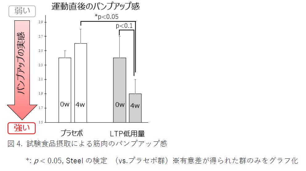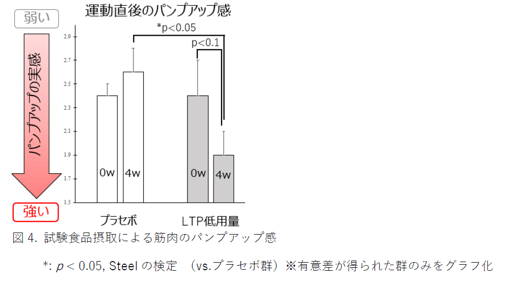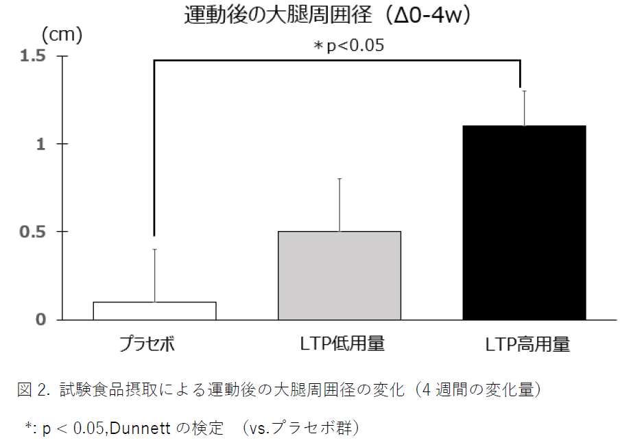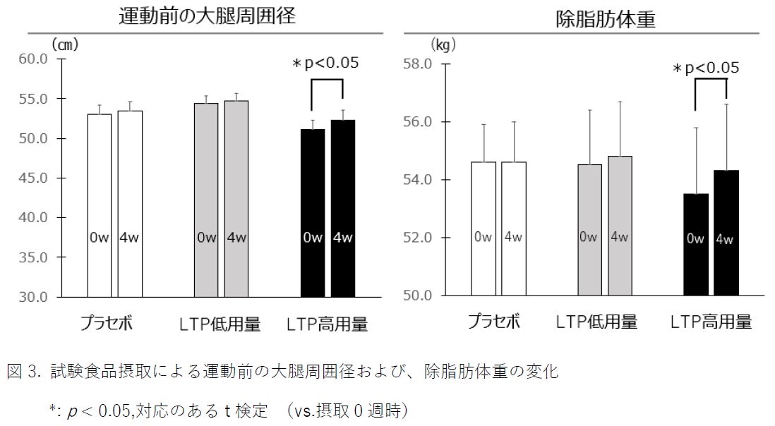 4週間の摂取前後で比較した結果、プラセボ群では運動前の大腿周囲径および除脂肪体重に有意な変化は認められませんでした。一方、LTP高用量群では、これらの指標が摂取開始時点と比較して有意に増加しました。