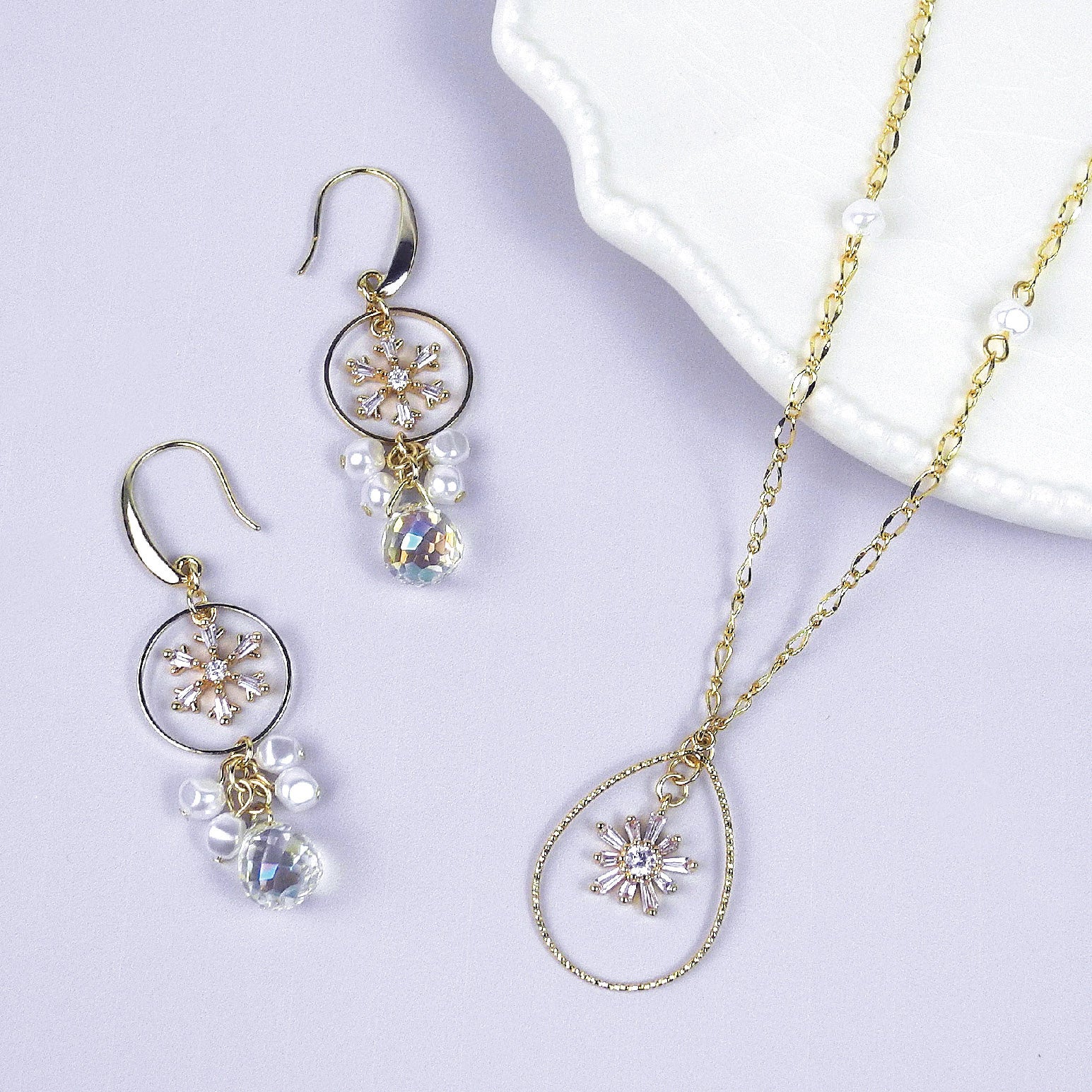 雪の結晶パーツをパールとカットガラスを使って上品なピアスに。