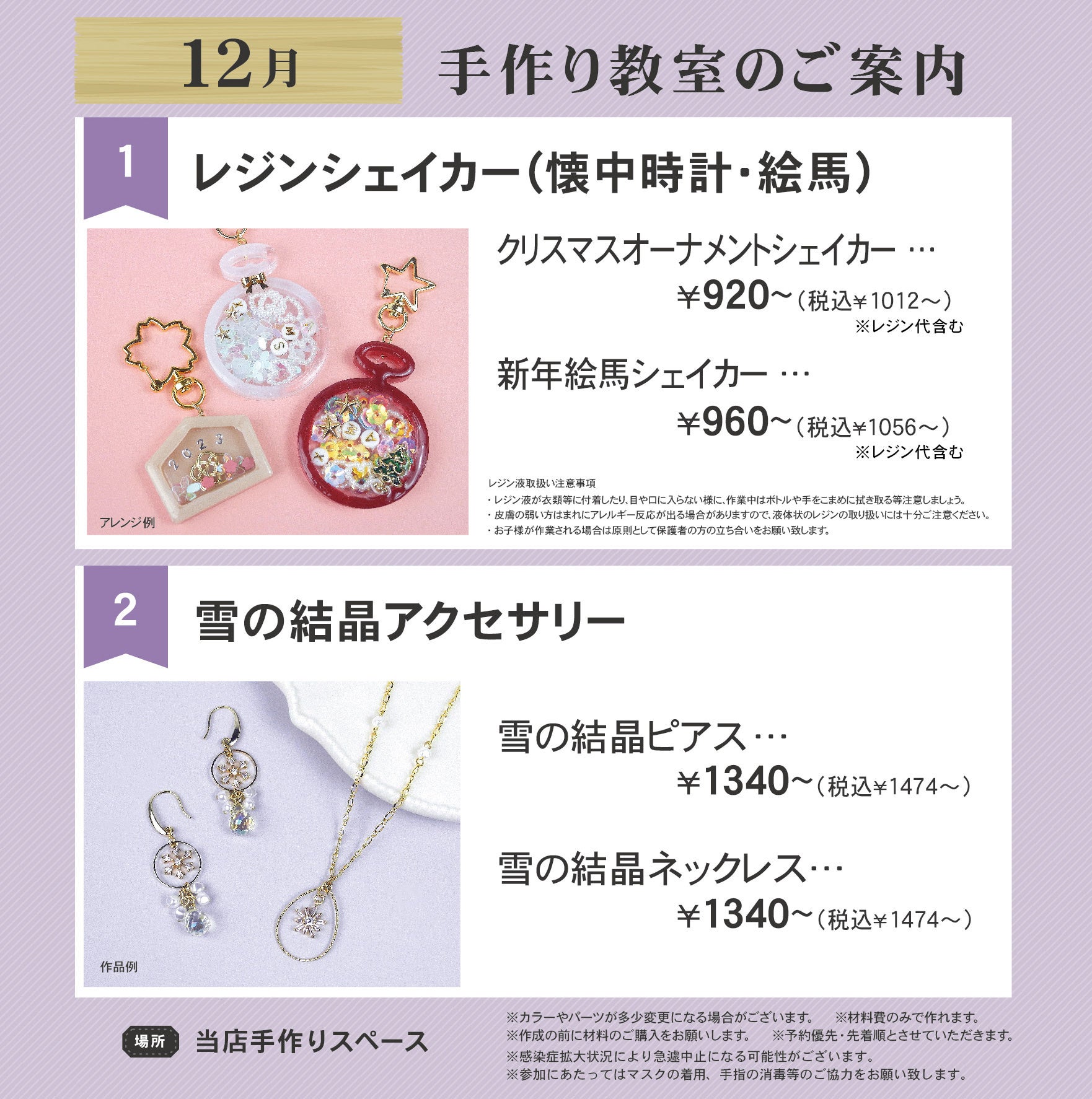 ビーズ&アクセサリーパーツショップPARTS CLUB。材料費だけで参加できる「手作り教室」12月の内容は人気のレジンシェイカーと雪の結晶パーツを使ったアクセサリー作り。
