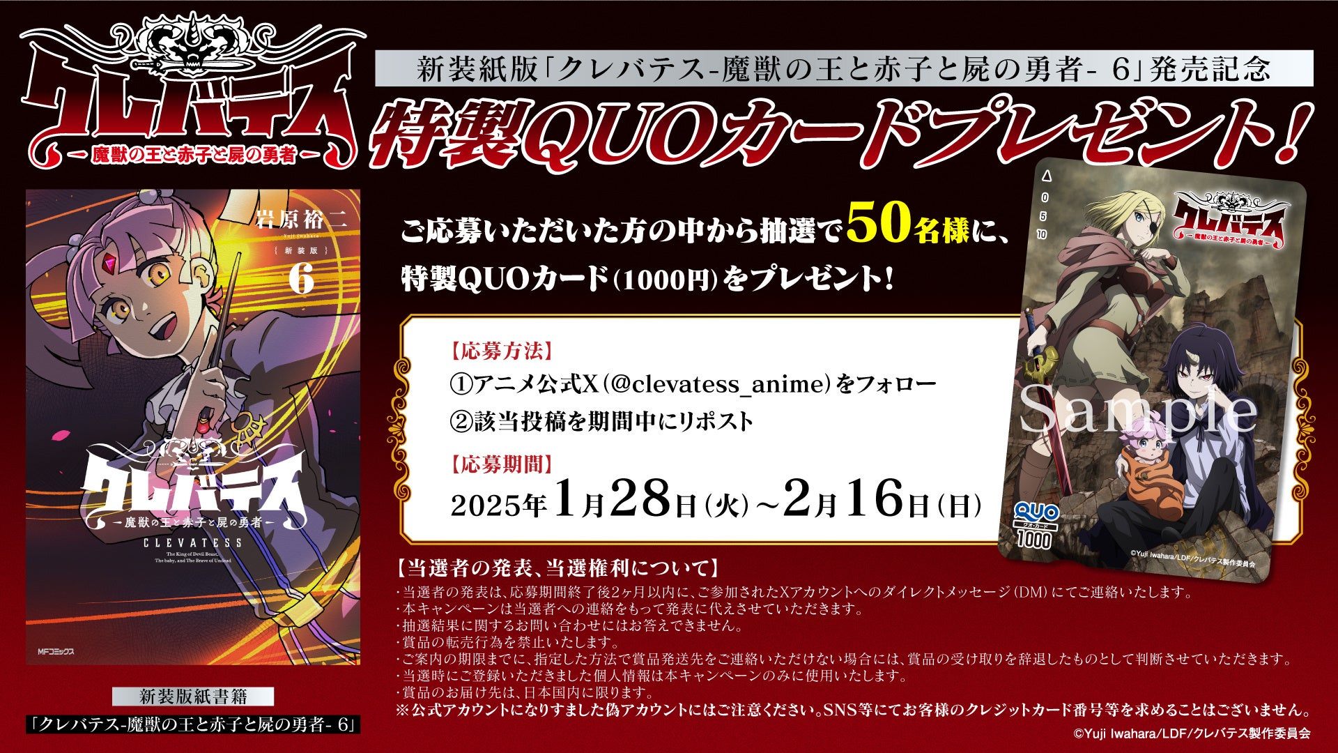新装版紙書籍「クレバテス-魔獣の王と赤子と屍の勇者- 6」の発売を記念して、アニメ公式Xアカウント(@clevatess_anime)をフォローし、該当投稿を期間中にリポストいただいた方の中から抽選で50名様に、特製QUOカード(1000円)をプレゼント!