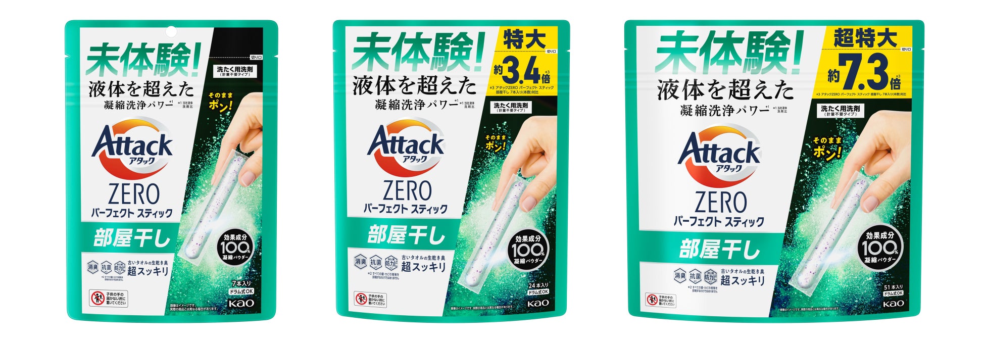 そこで、落ち切っていない皮脂汚れは、生乾き臭の原因の一つであることに着目した「アタック ZERO パーフェクトスティック 部屋干し」を新発売します。液体洗剤を超えた洗浄力*1と、ポンと入れるだけのラクさに加え、“部屋干しパワフル消臭技術”搭載で生乾き臭を解消し、部屋干しでも快適なお洗たくを提案します。
