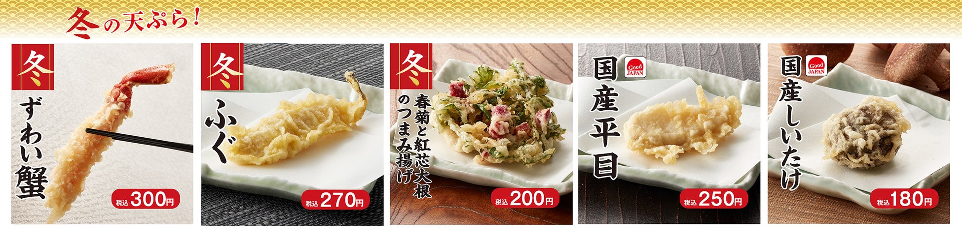 強い甘みの冬の定番「ずわい蟹」、凝縮された旨味と弾力ある尾付きの身が特長の「ふぐ」※、鮮やかな彩りとサクサクの歯ごたえの「春菊と紅芯大根のつまみ揚げ」、ジューシーで食べ応えのある「国産しいたけ」に、人気の「海老」の天ぷらを組み合わせ。 爽やかな「赤かぶ酢漬」も添えて華やかな一杯が誕生しました。