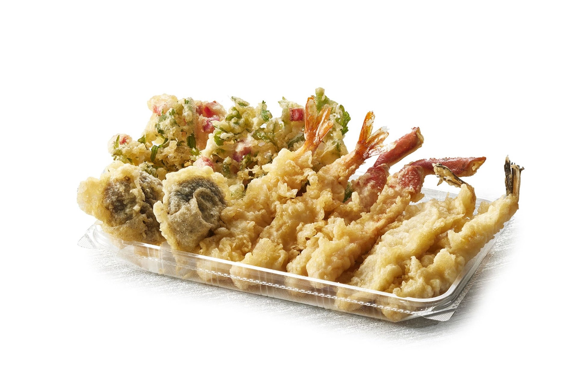 内容:海老2尾、むきえびとまいたけのつまみ揚げ、ひらさやいんげん