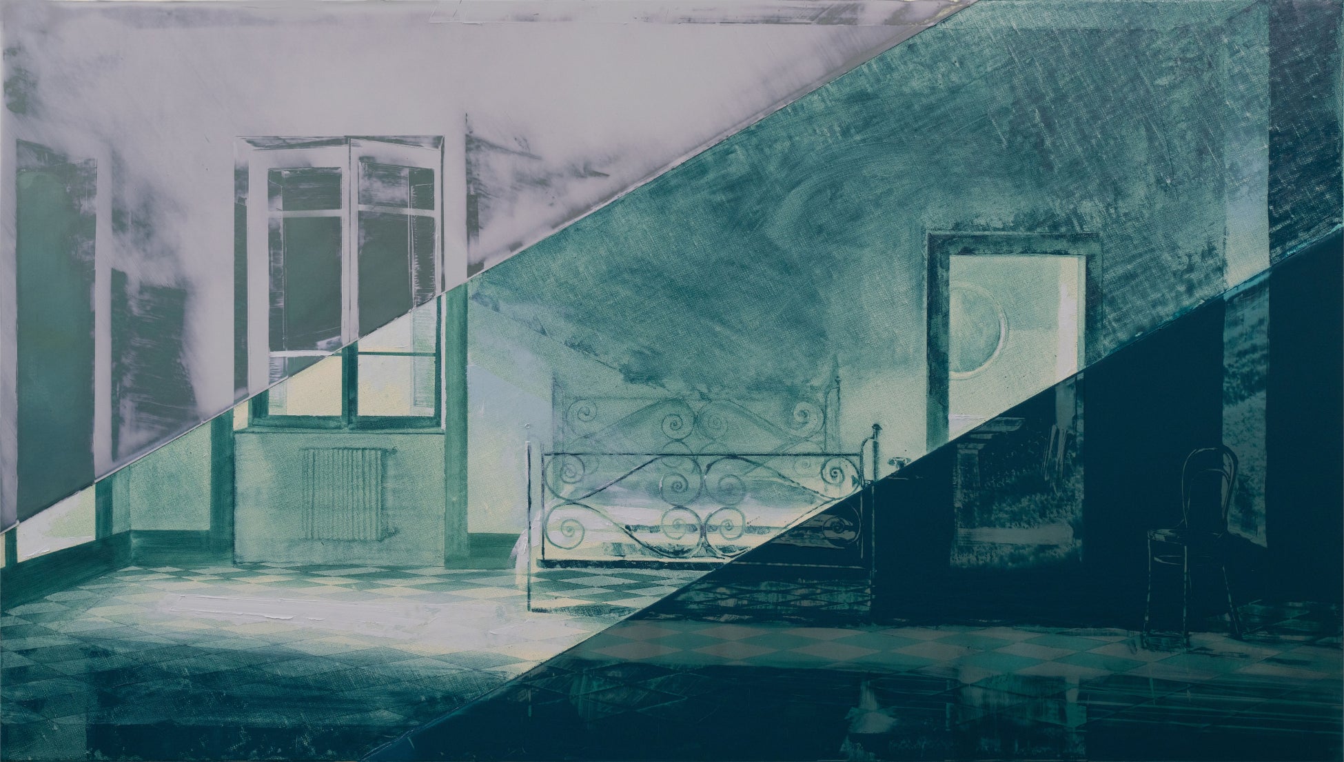CGなどで作り出された、どこか既視感のある空間イメージをモチーフとする菅雄嗣。二分割したキャンバス上で絵の具を塗る・削るという相反する行為を両立させる独自の手法を用いています。異なる技法とテクスチャーによって生み出されるひとつのイメージは、現実と架空の境界を横断する様を示唆しています。