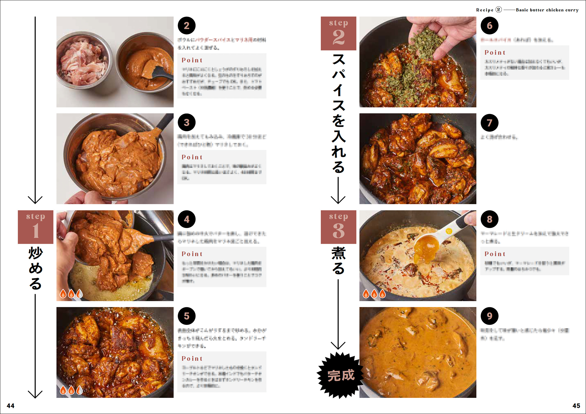 これまで60冊以上の著書を出してきた水野仁輔氏の本の中でも最も“プロセス写真が大きく多く、ていねいに”スパイスカレーの基本の作り方をに解説した本。
