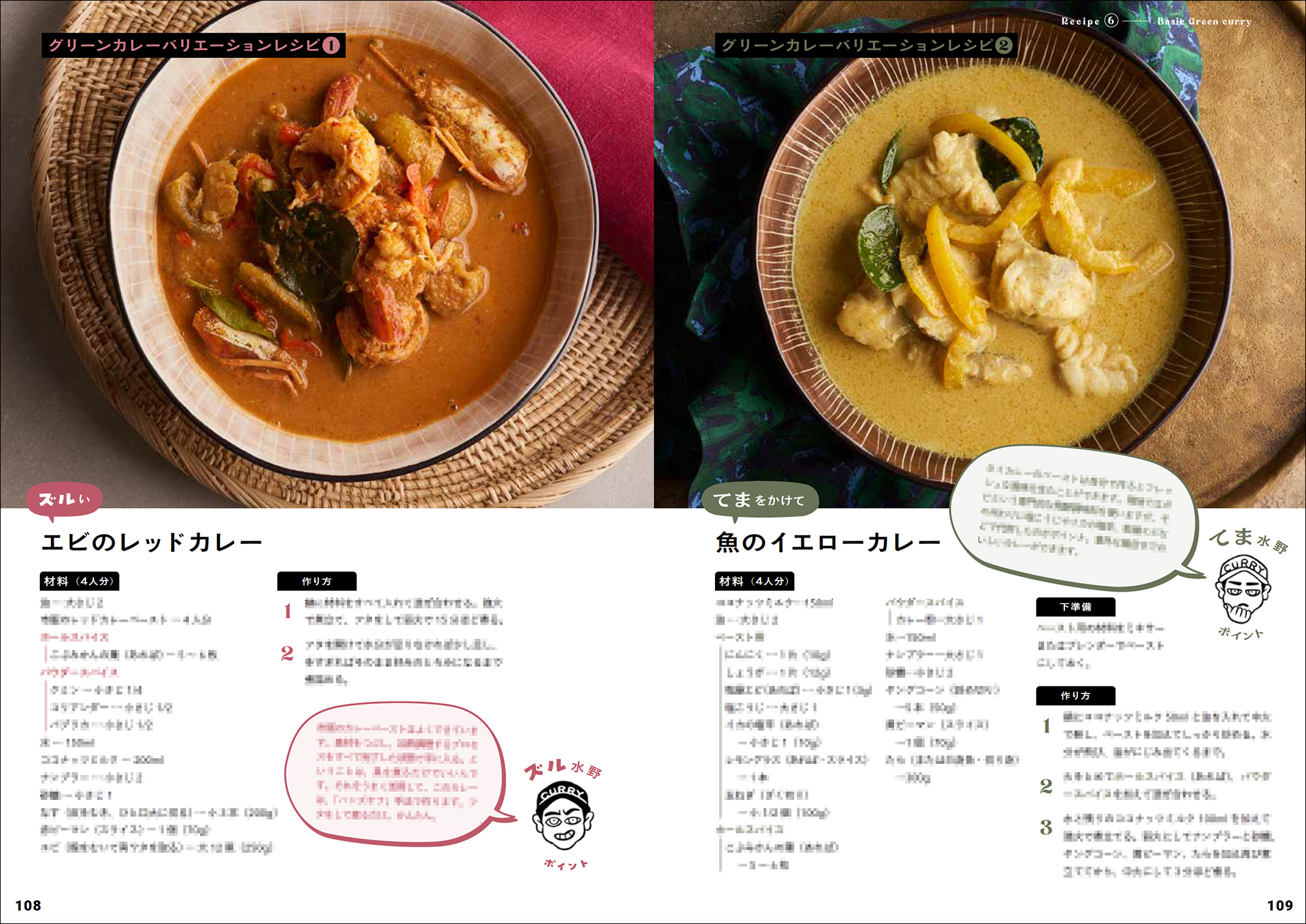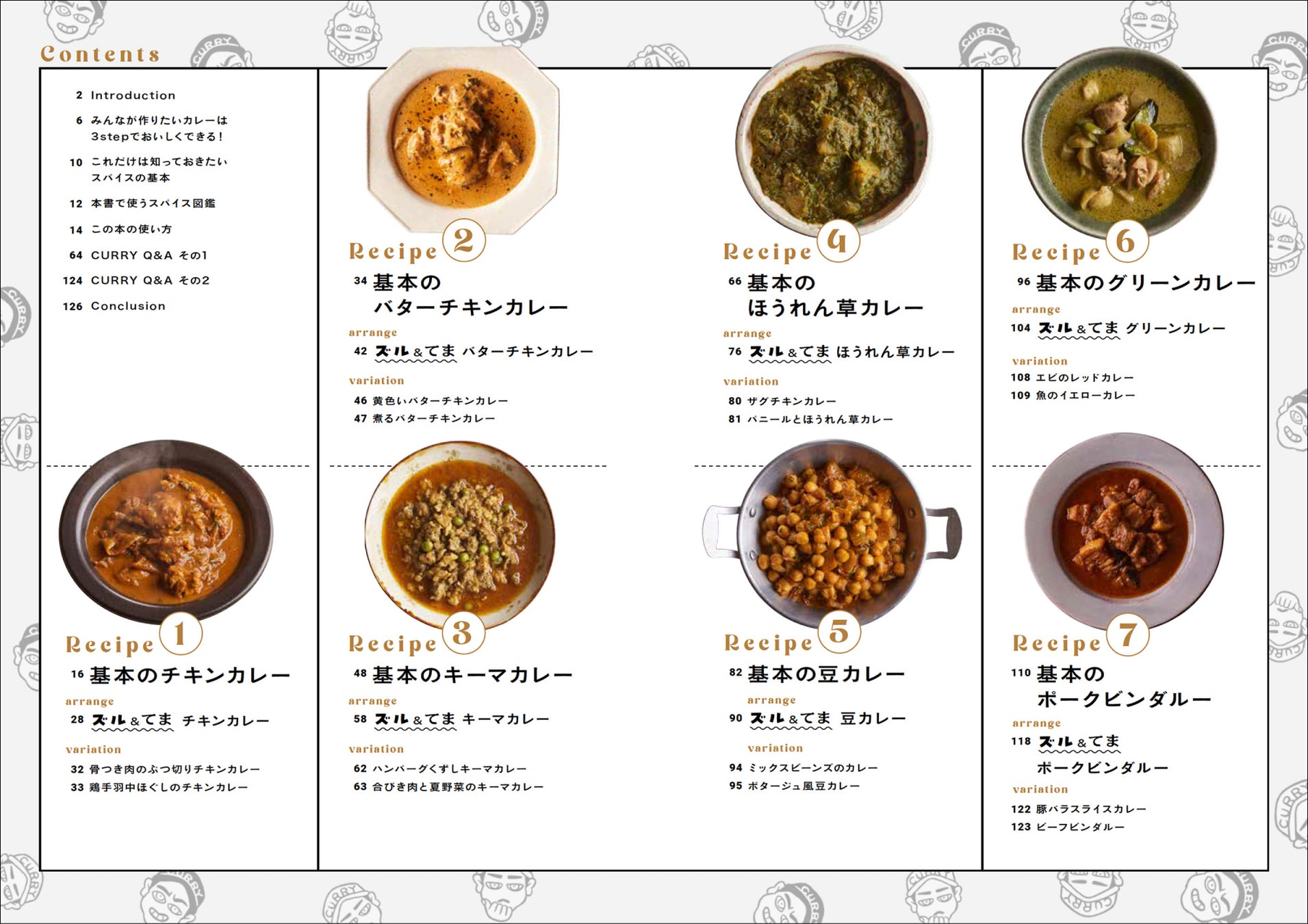 特に人気の高い「チキンカレー」「バターチキンカレー」「キーマカレー」「ほうれん草カレー」「豆カレー」「グリーンカレー」「ポークビンダルー」の7つのカレーを失敗ポイントや雑学を交えながら、“初心者向けに”ていねいに解説しています。また、誰でもかんたんにおいしくできる「ズルい」テクニックも掲載。ケチャップやチキンブイヨンの素、ソースなど、家にあるものを隠し味に使うことで、家カレーを格上げする方法も紹介。