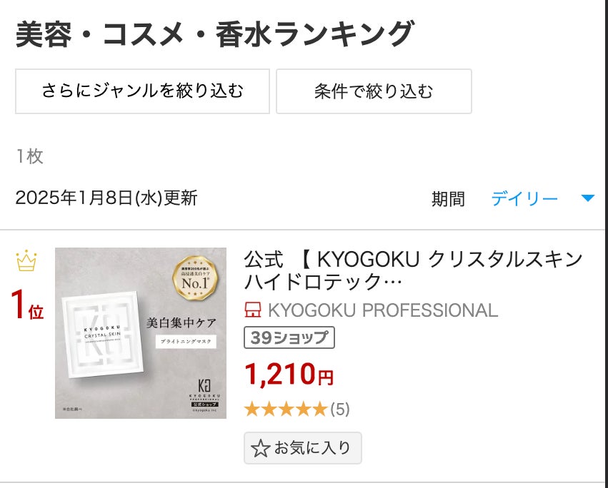 楽天市場で「KYOGOKU クリスタルスキン ハイドロテックブライトニングマスク」が19冠をいただきました!