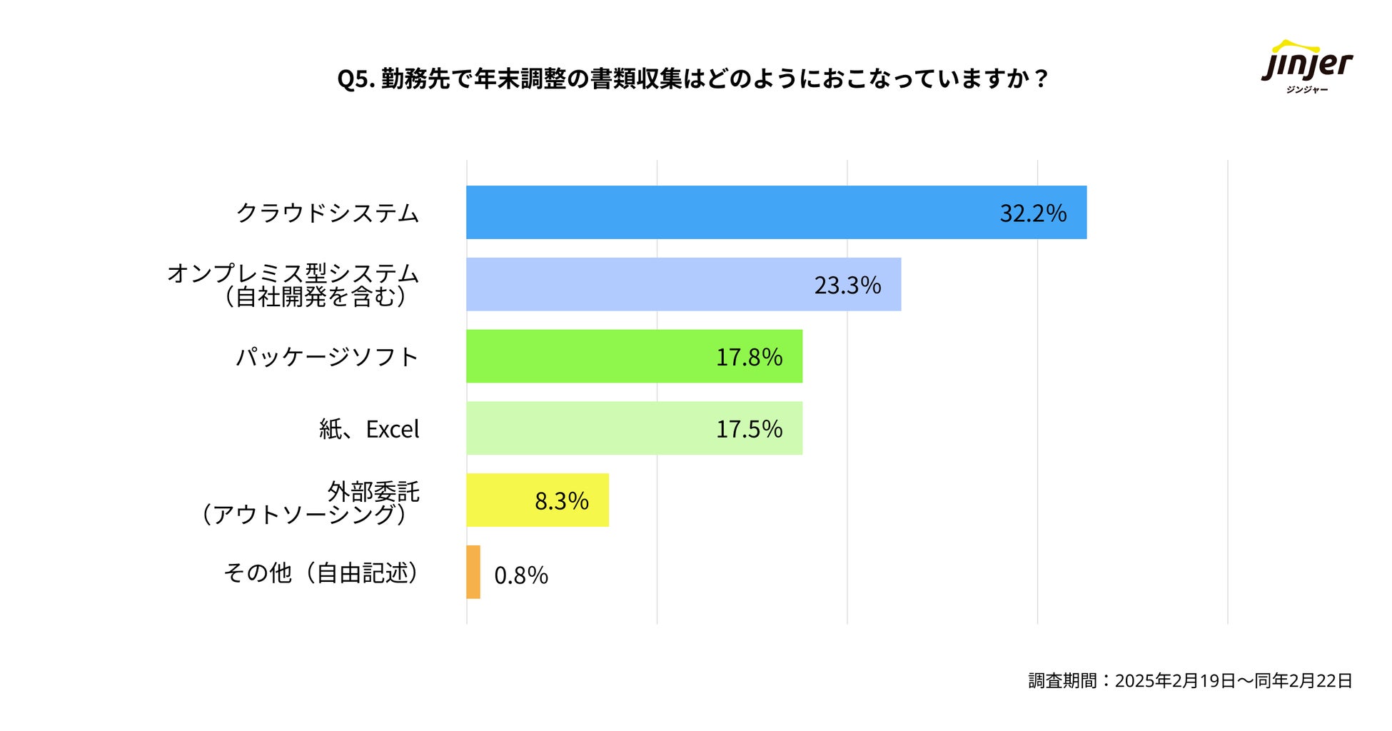 「106万円の壁」に該当した従業員の年末調整を収集する上で、重要な業務の一つである「年末調整の書類収集方法」について質問したところ、最も多かった回答は「クラウドシステム(32.2%)」でした。