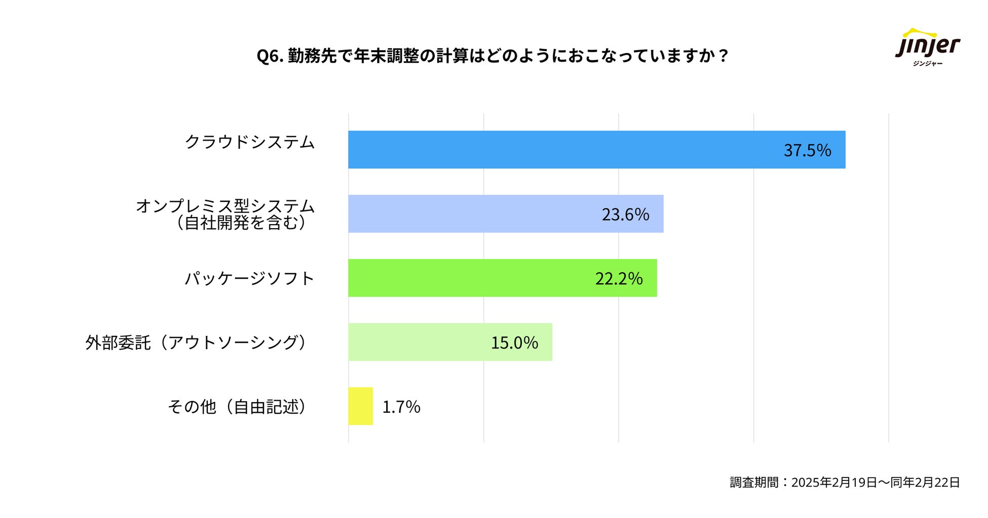 「106万円の壁」に該当した従業員の年末調整を行う上で、重要な業務の一つである「年末調整の計算方法」について質問したところ、最も多かった回答は「クラウドシステム(37.5%)」でした。
